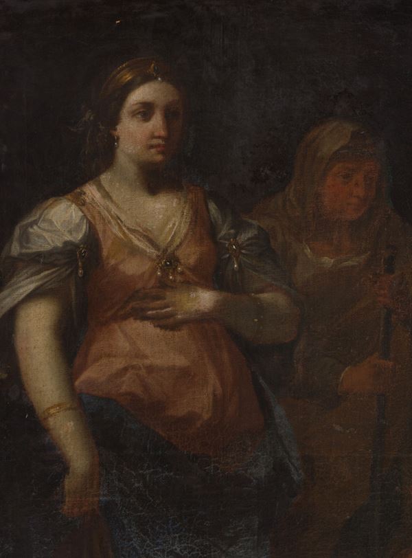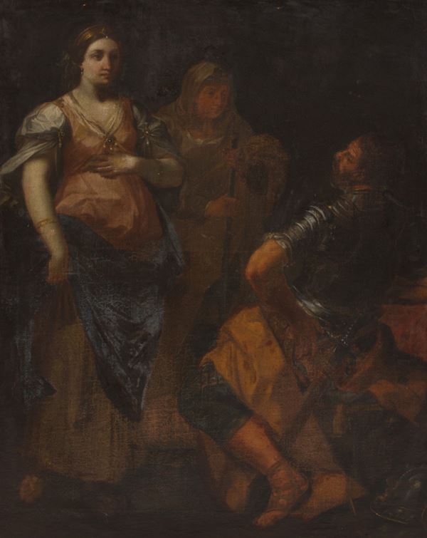 Oil painting on canvas depicting "MEETING OF DAVID AND ABIGAIL". 17th century. In frame. Defects and restorations. Already relined and reframed.