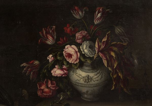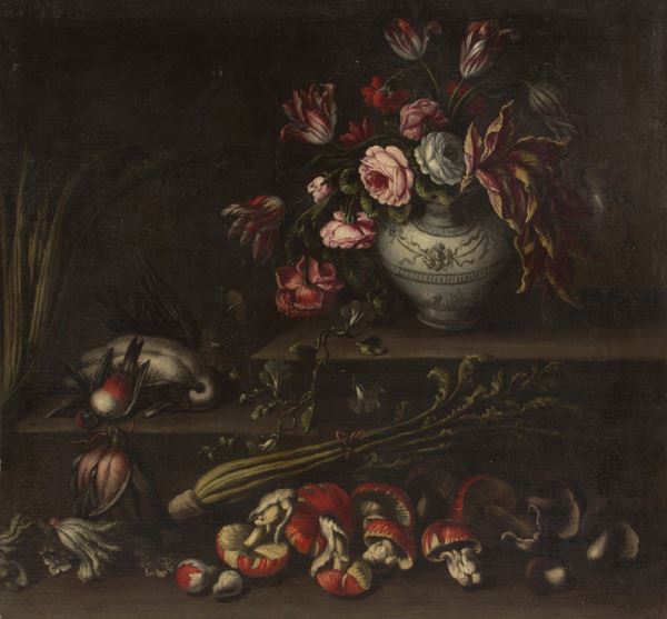 Oil painting on canvas depicting "STILL LIFE". Second half of the 17th century. In a carved and gilded frame. Already relined and reframed. Restorations.