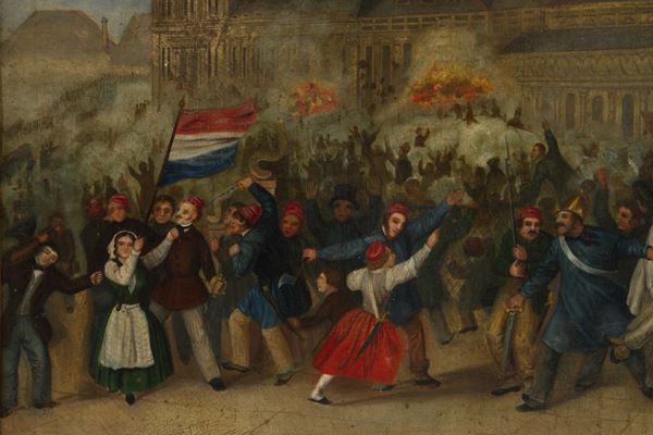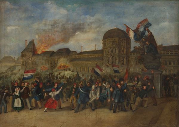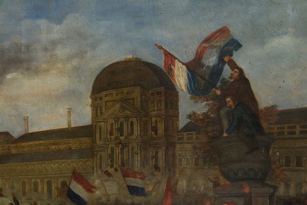 Oil painting on canvas depicting "STORMING OF THE BASTILLE". 19th century. In a golden frame. Already relined and reframed.