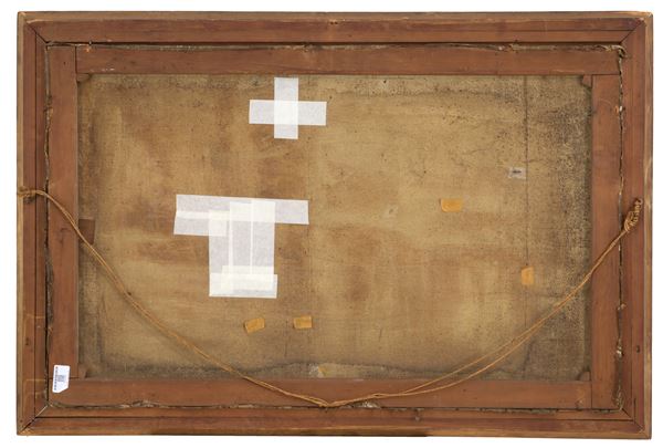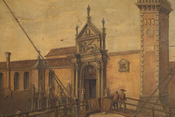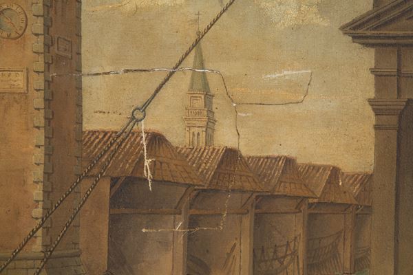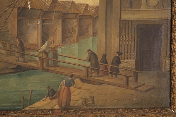 Oil painting on canvas depicting "VENICE ARSENAL". 18th century. In frame. Defects, breakages and signs of wear and tear over time.