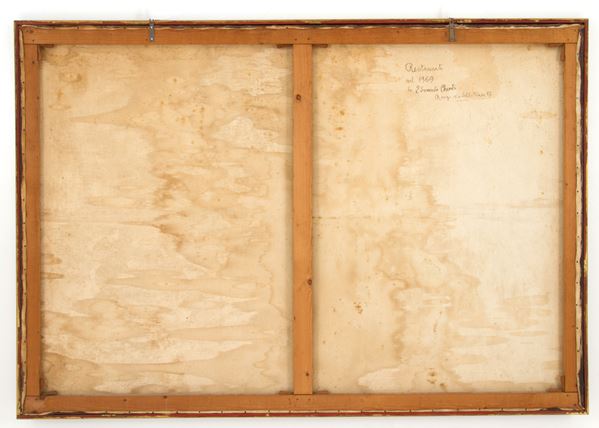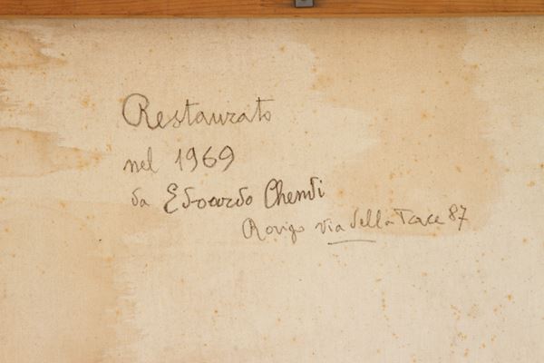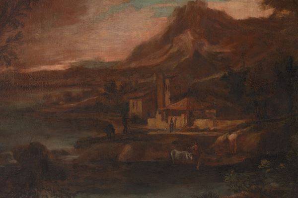 Oil painting on canvas depicting "LANDSCAPE WITH TOBIA AND THE ANGEL". In a gilded wooden frame. 18th century. Already relined and reframed. Restorations.