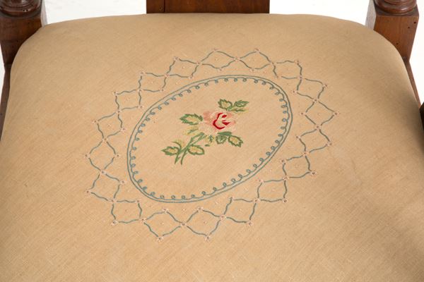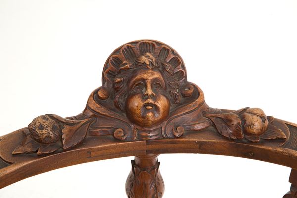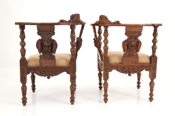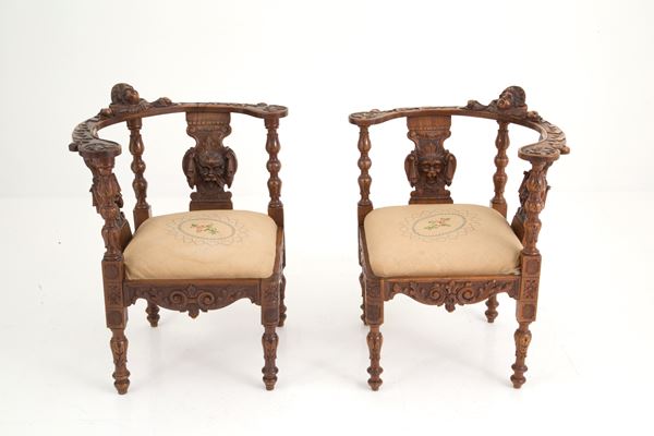 Pair of carved walnut armchairs with curved backrest, turned legs and folders with masks and padded seats. Late 19th century. Minor defects.