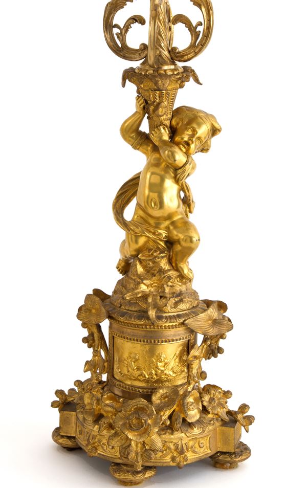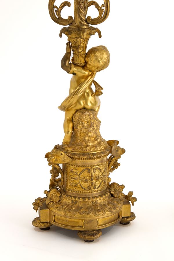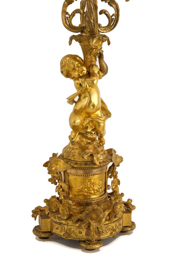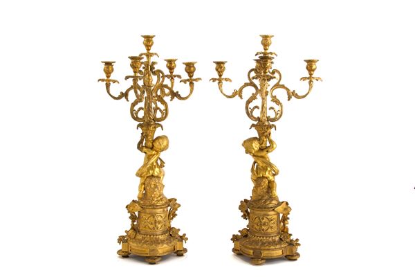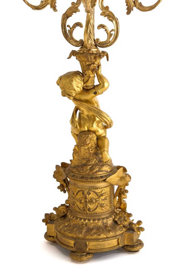 Pair of five-flame candelabra in finely chiseled and gilded bronze in the guise of cherubs. 19th century.