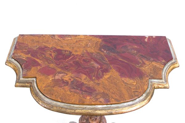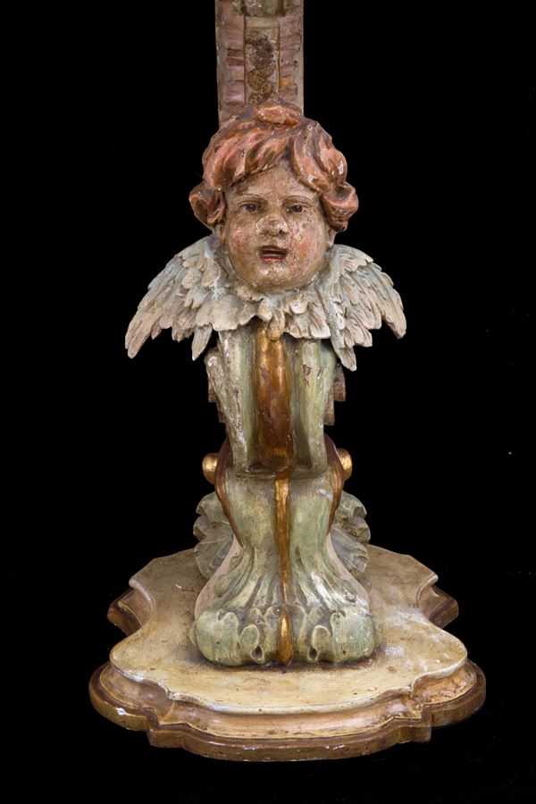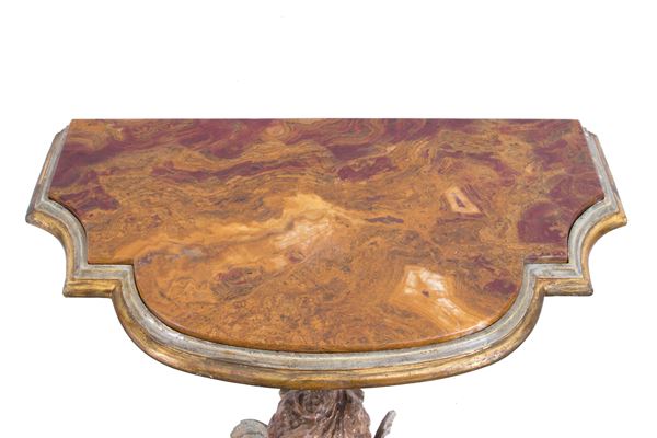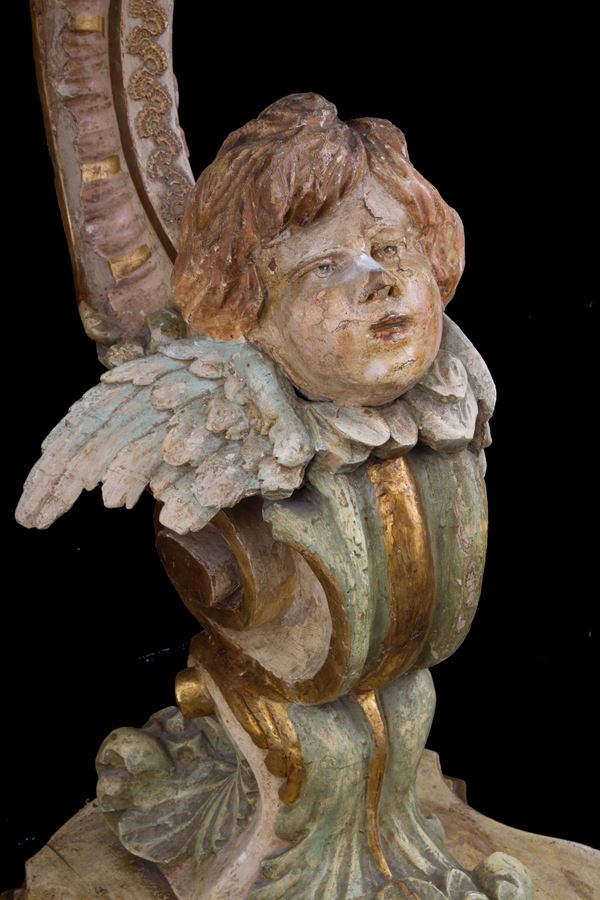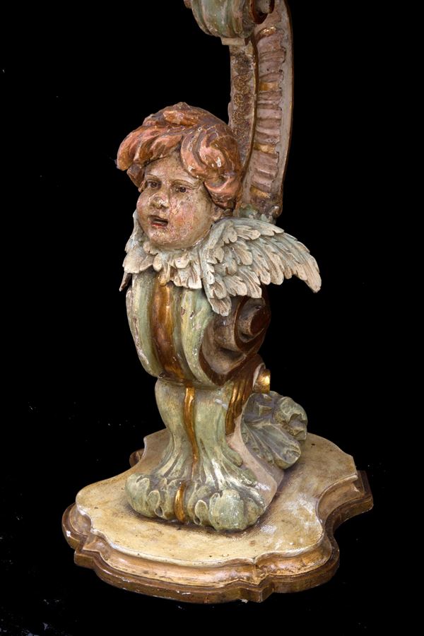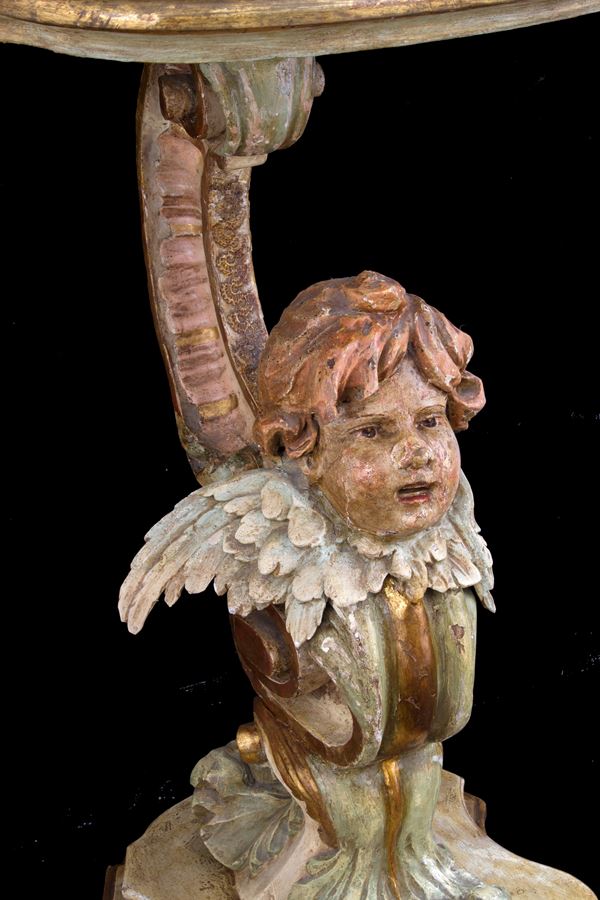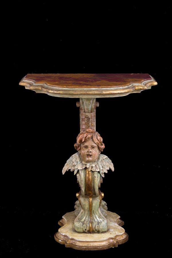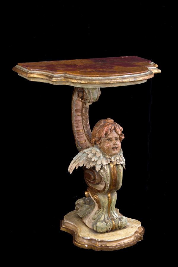 Pair of small consoles in carved, lacquered and gilded wood with cherubs. Marble top. 19th century. Defects.
