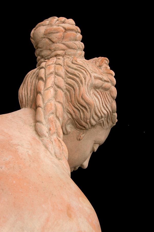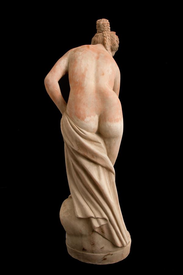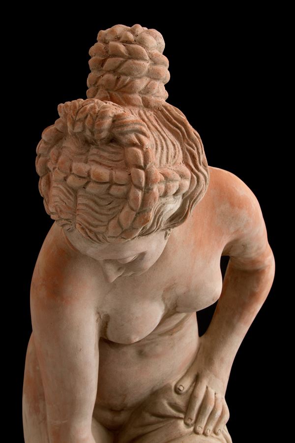 Terracotta sculpture depicting "VENUS AT THE BATH". Early 20th century. Signs of wear over time.