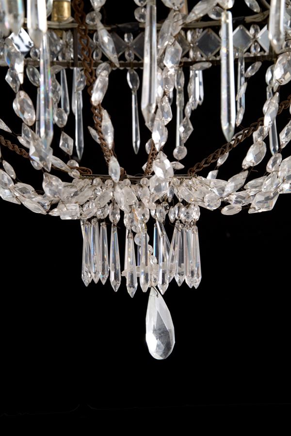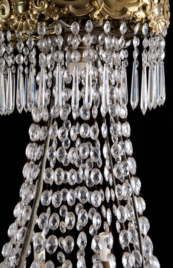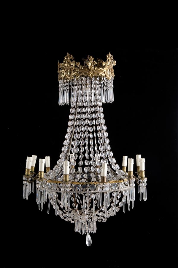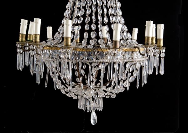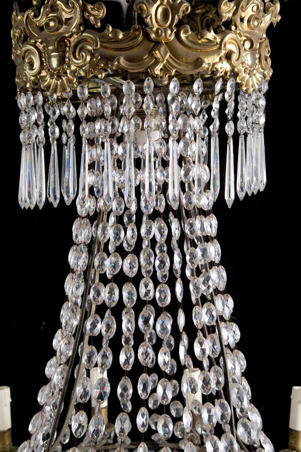 Twelve light balloon chandelier in golden sheet metal with crystal drops. Tuscany. Early 19th century. Defects.