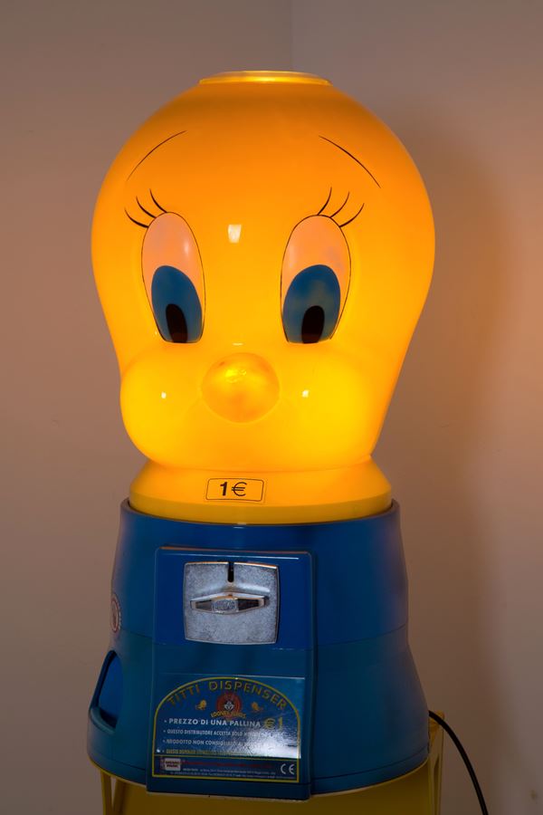 Vending machine transformed into a lamp in plastic and metal depicting "TITTI" with lighting on the coin acceptor.