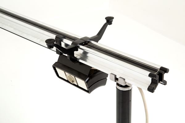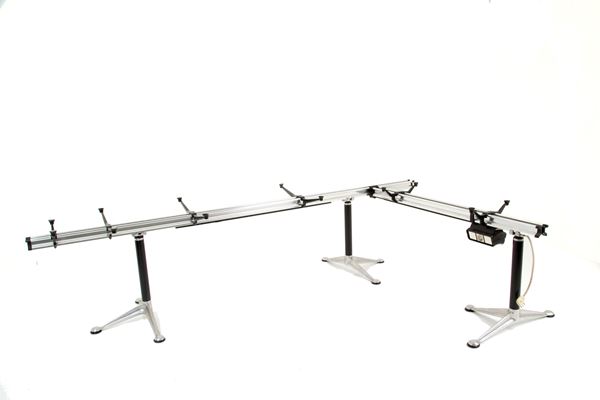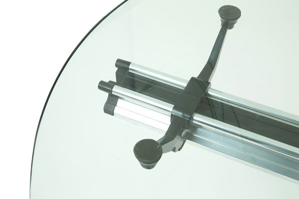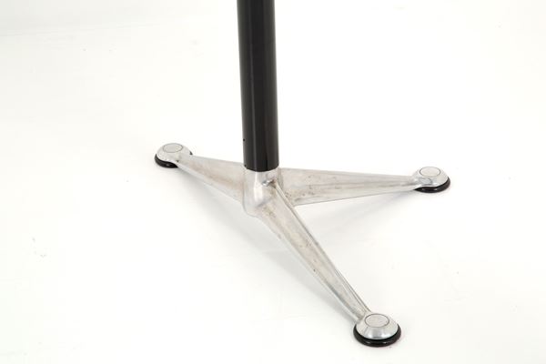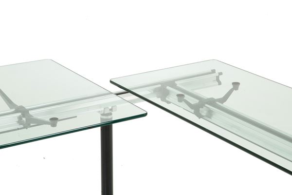 Large desk in lacquered metal, aluminum, MDF and resin with three glass shelves and under-counter electrical outlets. Manufactured by HERMAN MILLER (Attr.). 1980s. Signs of wear and tear and missing chest of drawers.