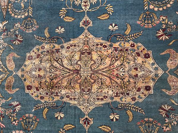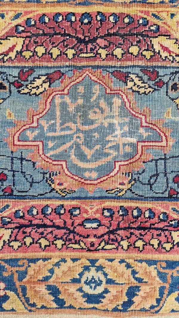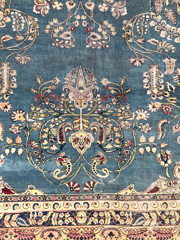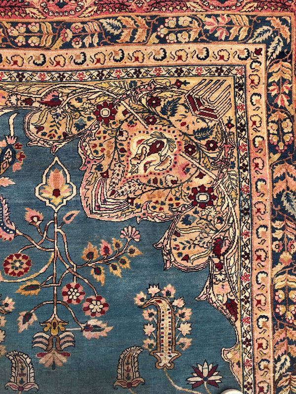 Kirman Laver carpet. Persia. Late 19th century. Signed ABU TAHER MAJIDI. Four original sides, signs of wear over time.