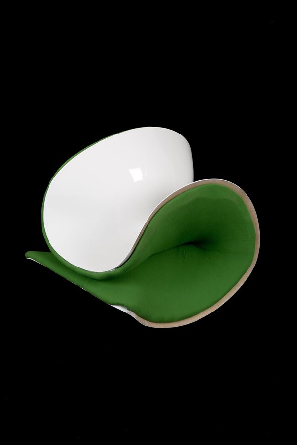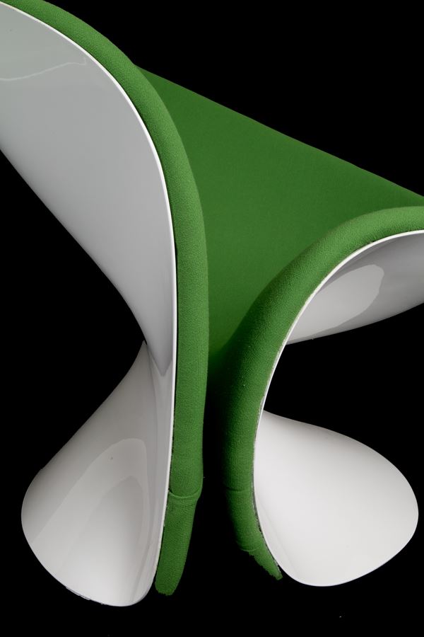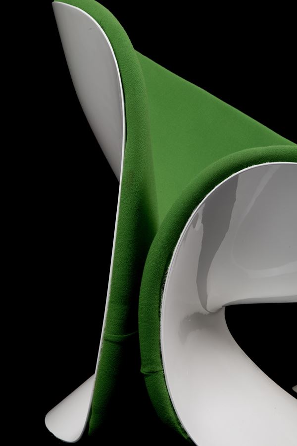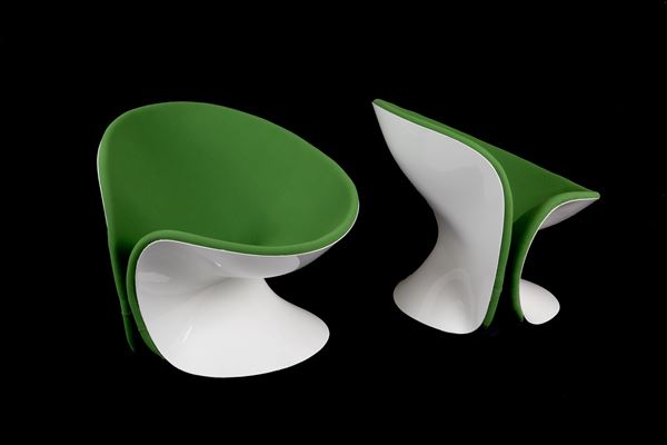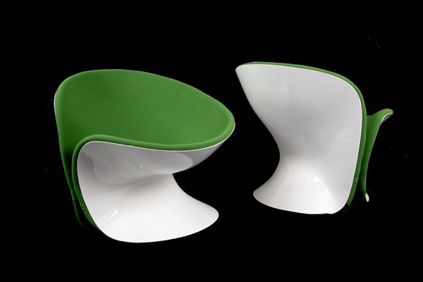 Pair of Girolle armchairs in white fiberglass and green fabric. THONET production. 1970s. Signs of wear and tear.