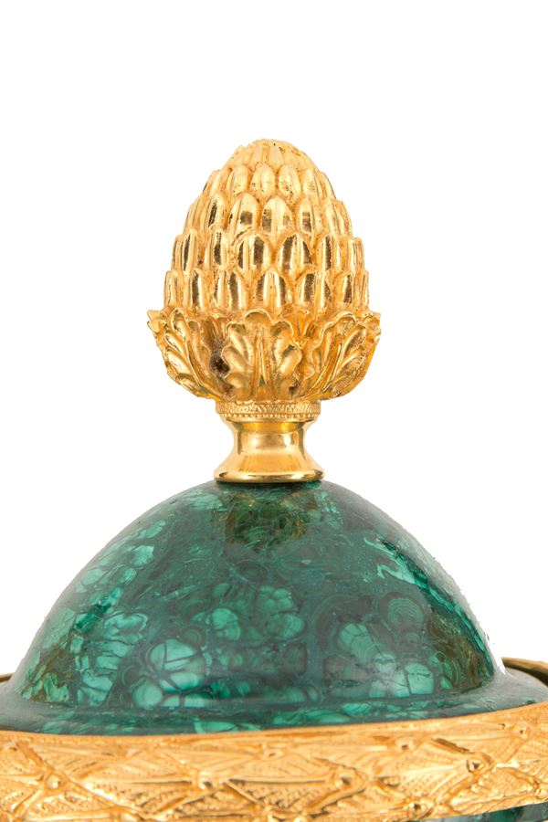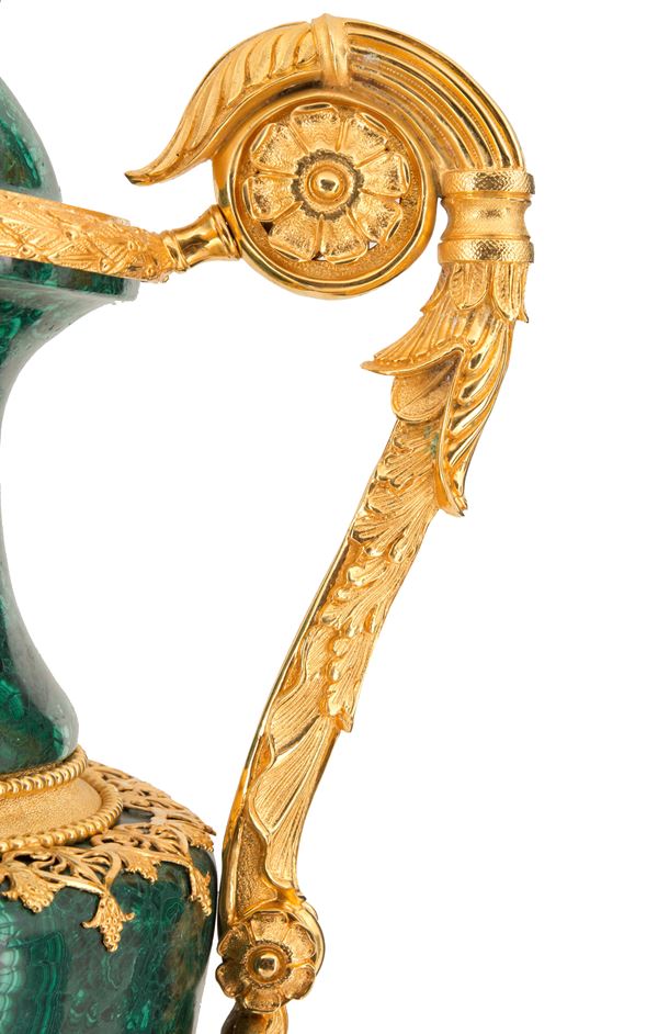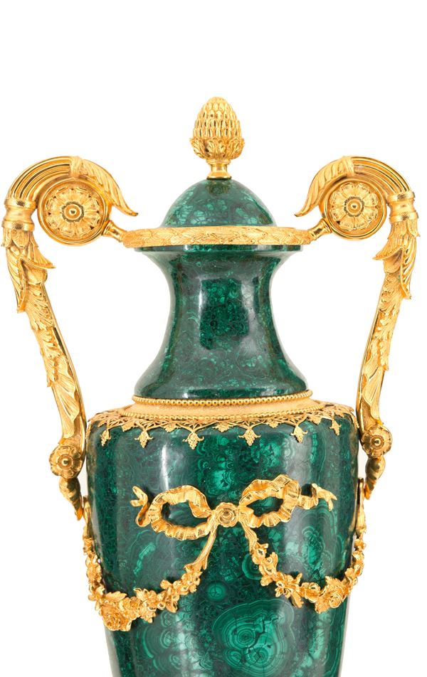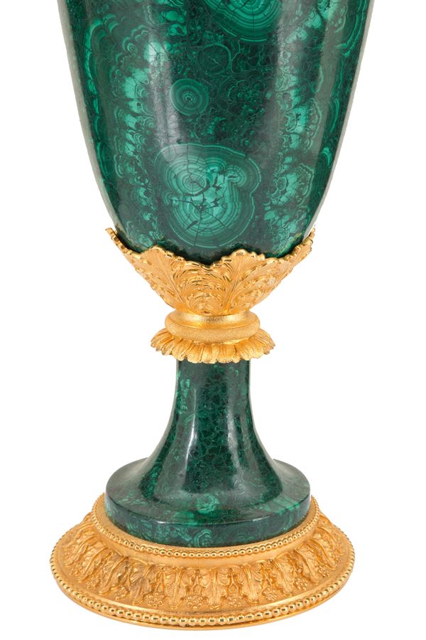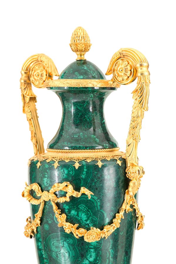 Malachite vase with handles, finishes and decorations in finely chiselled and gilded bronze, approx. 58 kg.