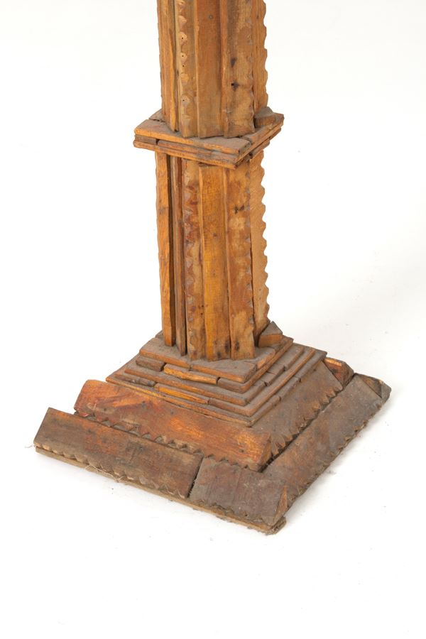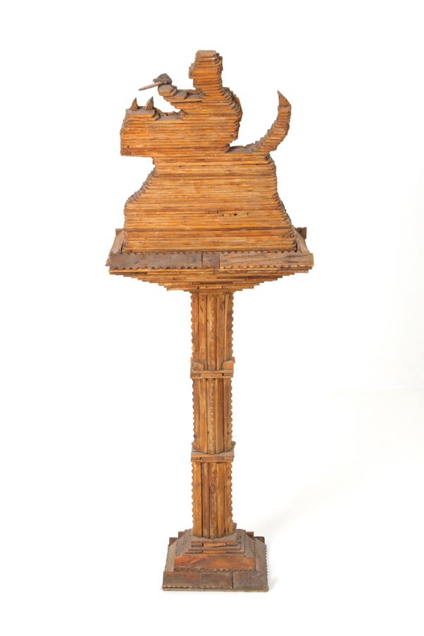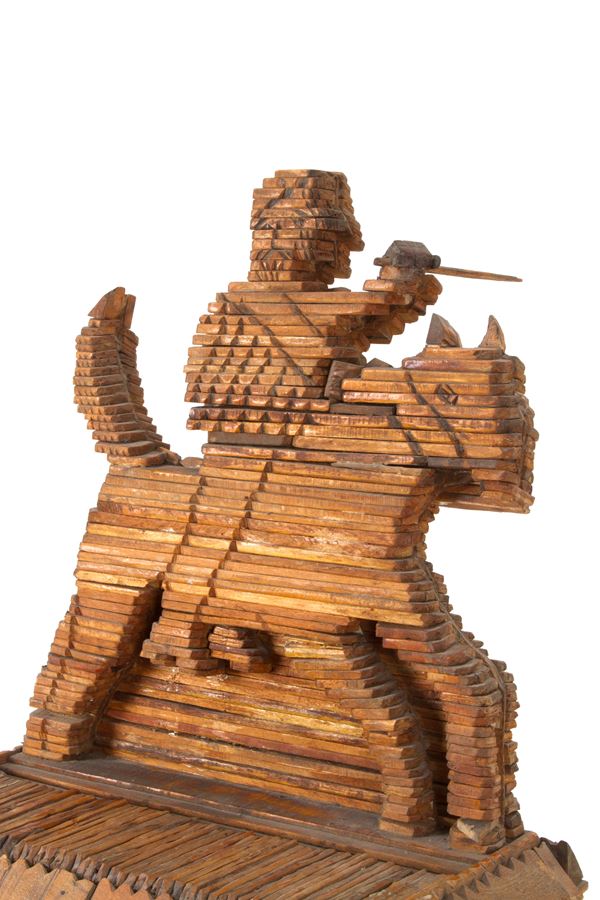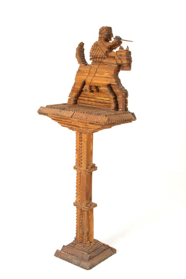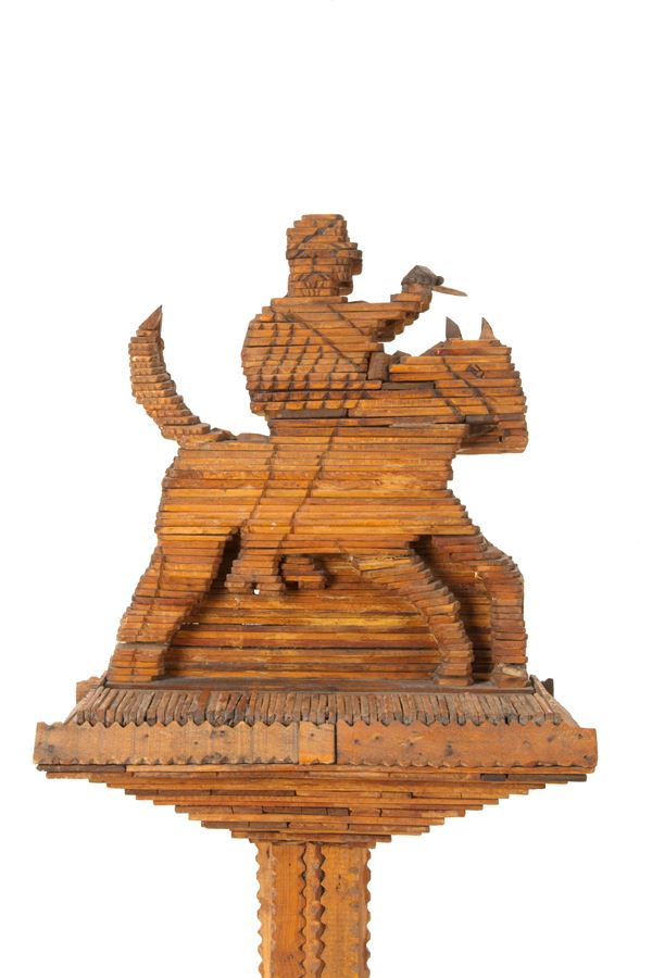 Column-sculpture in colored wooden pieces depicting "CHARACTER ON HORSEBACK". 1970s. Published in the artist's monograph edited by Bianca Tosatti, art critic specialized in Art Brut, in 2012, p. 66, n. 22.