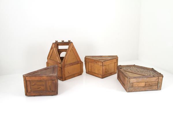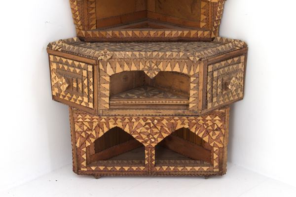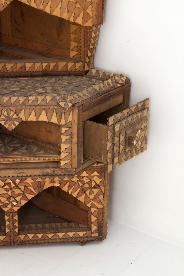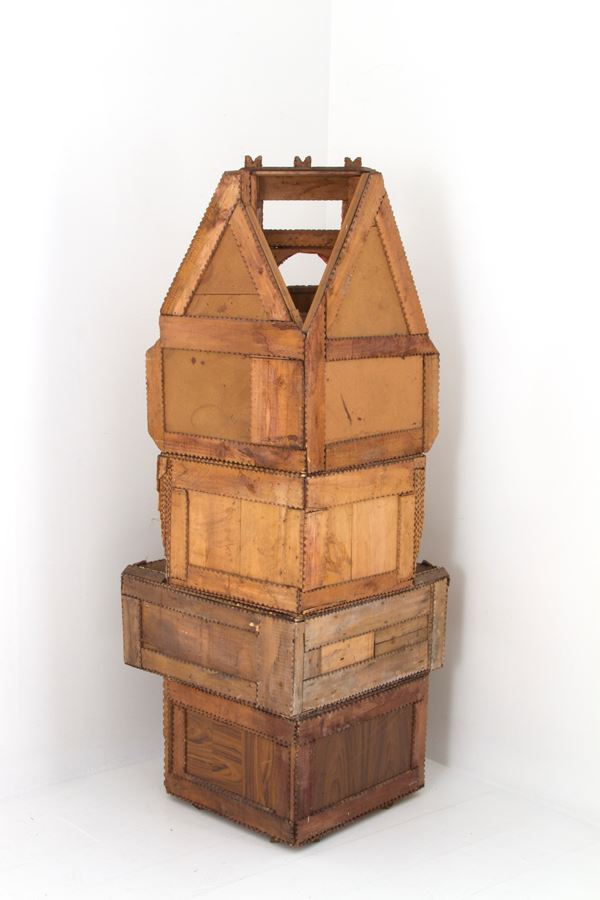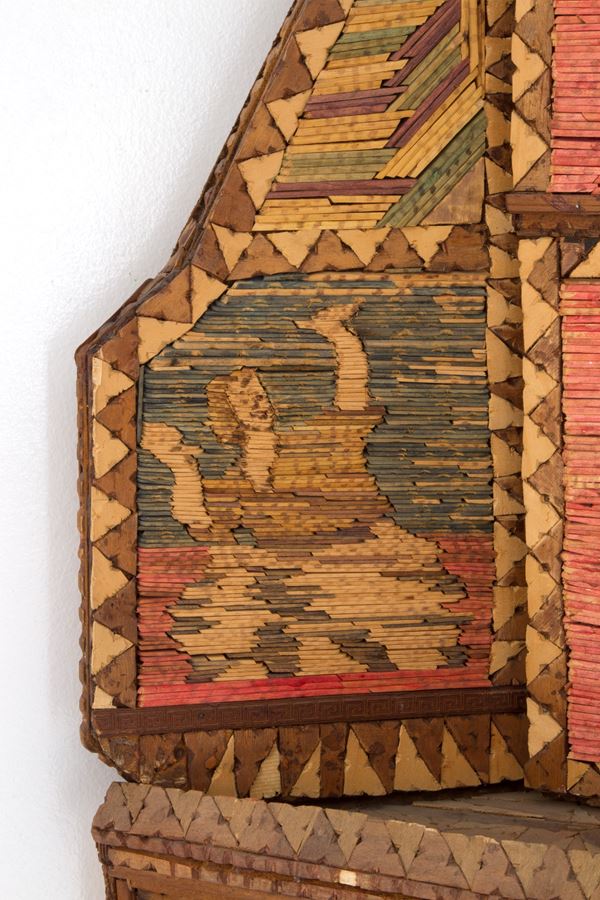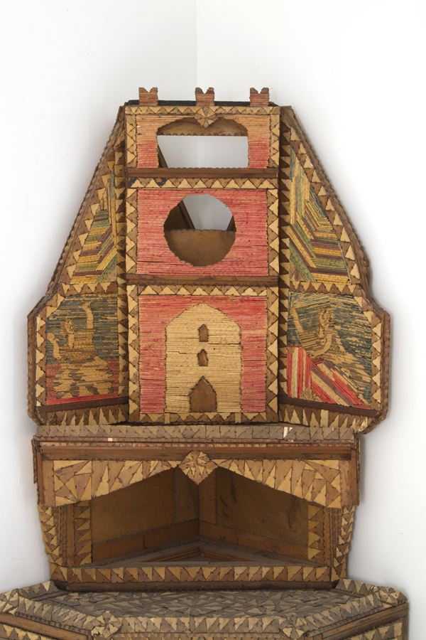 Four-body corner cupboard with two figures and various decorations, made with colored wooden dowels. 1980s-1990s. Published in the artist's monograph edited by Bianca Tosatti, an art critic specialized in Art Brut, in 2012, p. 176, n. 90.