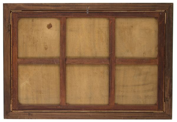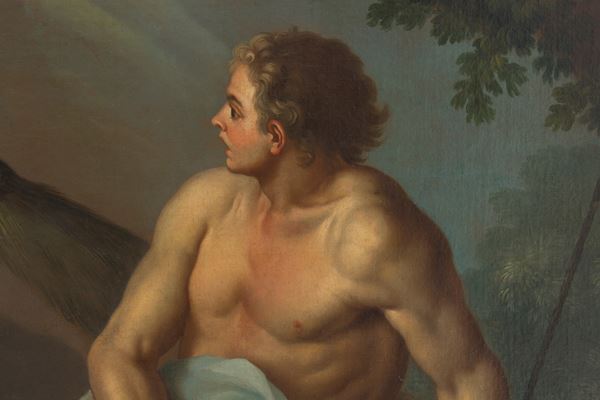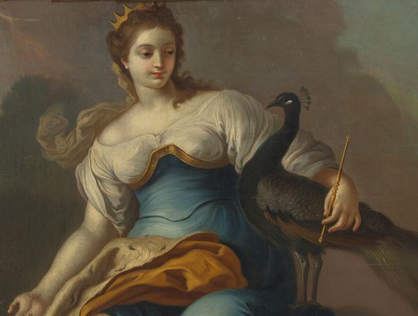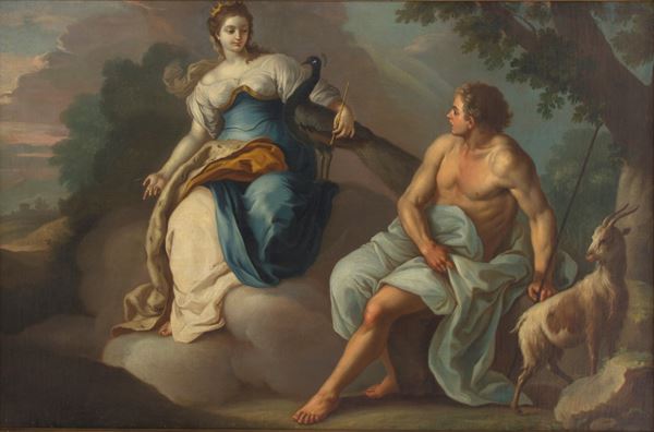 Oil painting on canvas depicting "JUNO WITH SHEPHERD". 18th century. Framed. Already relined and restretched. Defects.