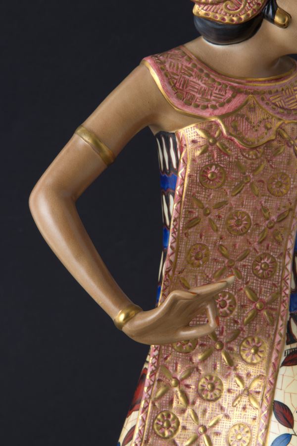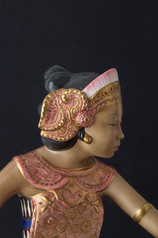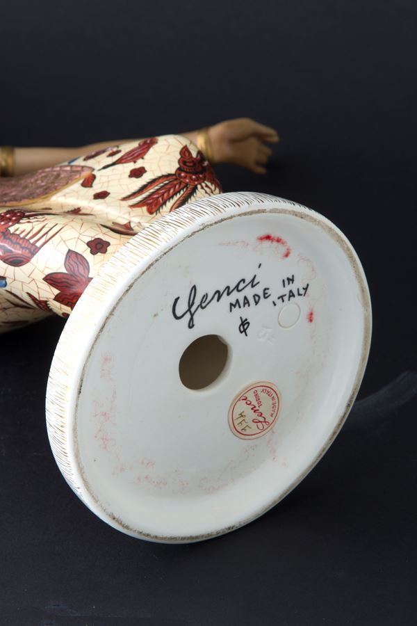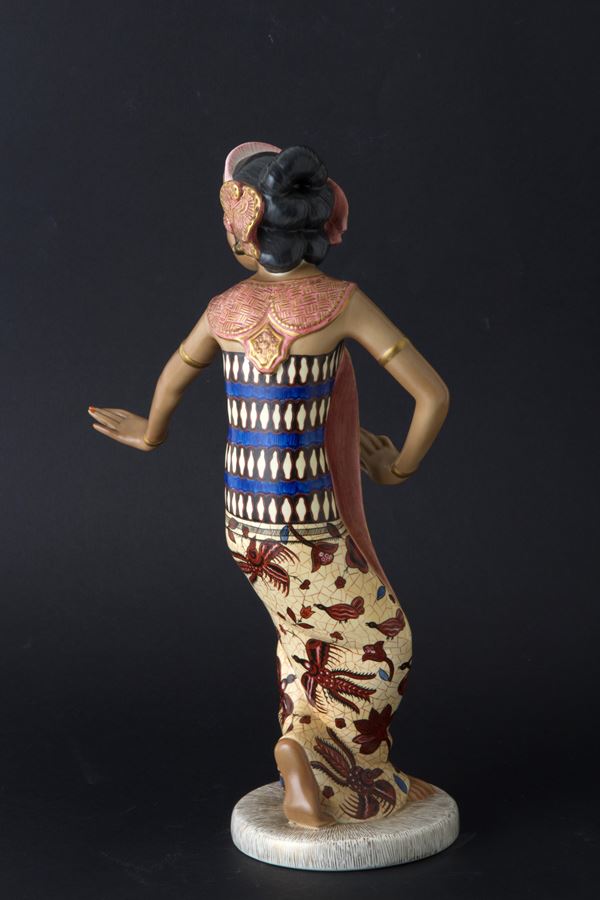 Polychrome enameled and gilded ceramic sculpture depicting "JAVANESE DANCER". LENCI manufacture. With label and writing 'Lenci Torino Made in Italy' and label with number 994 on the bottom.