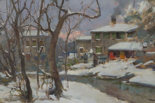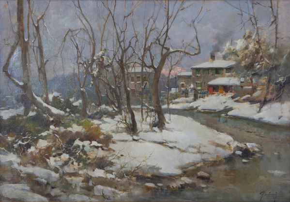 Oil painting on canvas depicting "SNOWY LANDSCAPE". Signed lower right. In a gilded wooden frame.