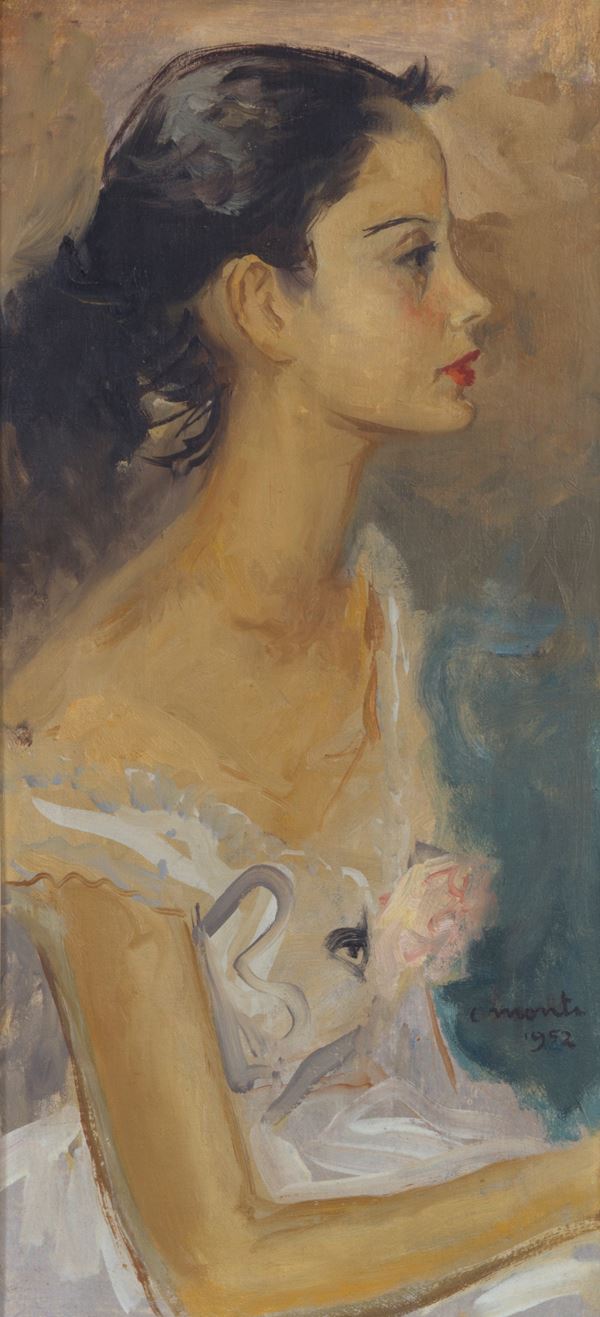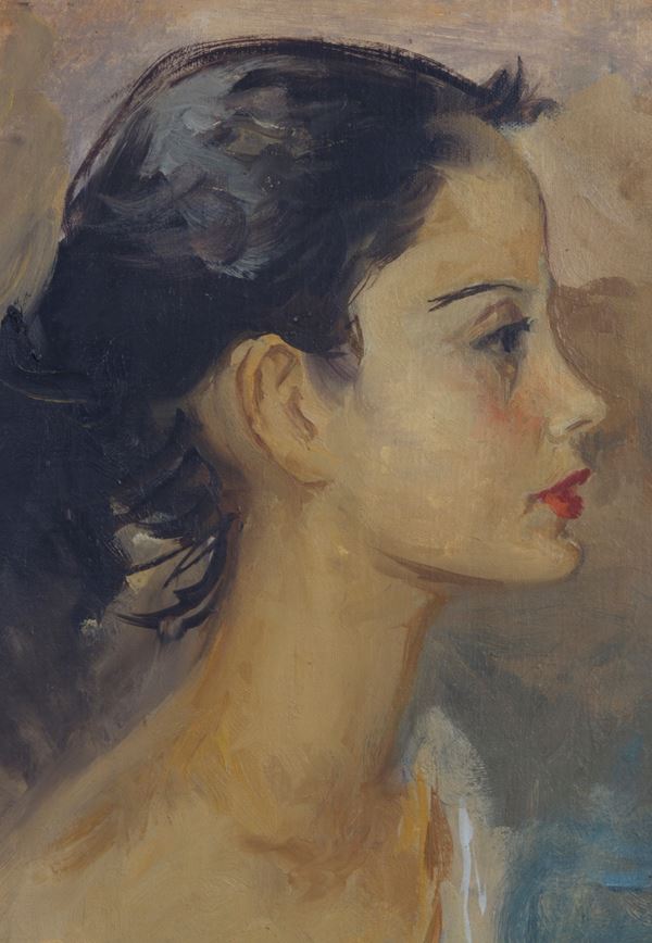 Oil painting on canvas depicting "GIRL IN PROFILE". Signed and dated 1952 lower right. Framed.