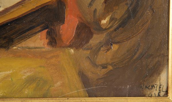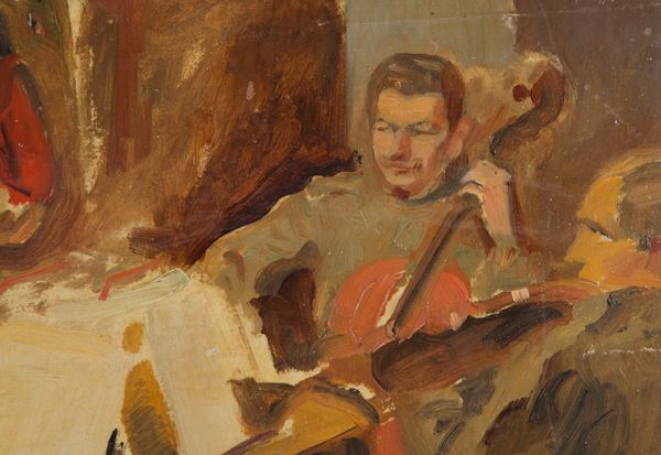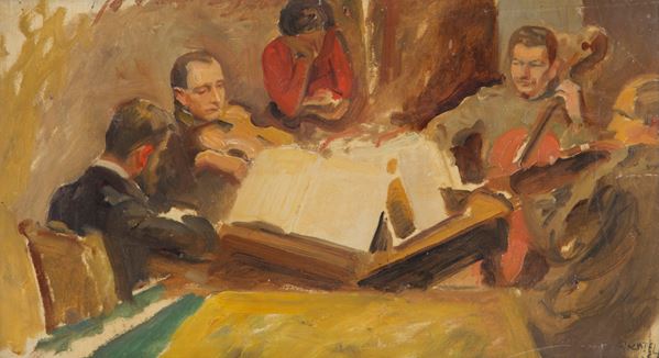 Oil painting on panel depicting "MUSICIANS". Signed S. WACHTEL and dated 916 lower right. In a gilded frame.