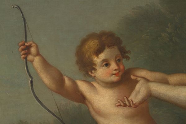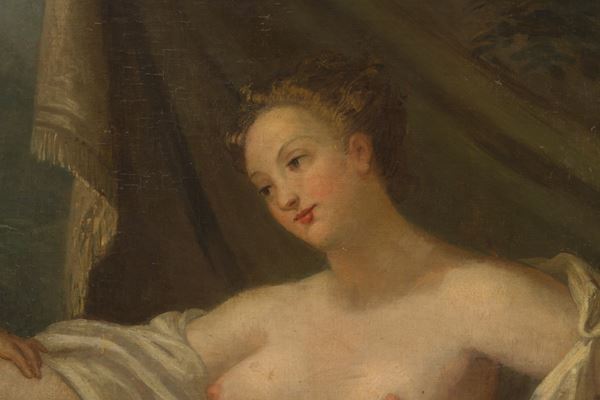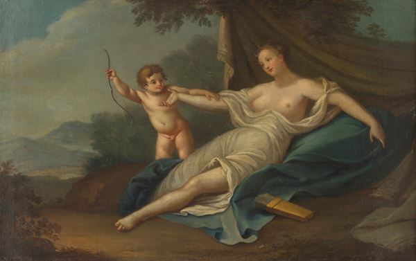 Oil painting on canvas depicting "VENUS AND CUPID". 18th century. Framed. Already relined and restretched. Defects.