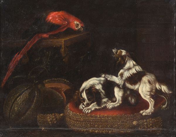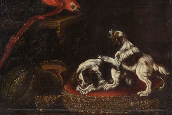 LOMBARD MASTER OF THE EARLY 18TH CENTURY. Oil painting on canvas depicting "STILL LIFE WITH DOGS, PUMPKIN AND PARROT". In a gilded frame. Already relined and re-stretched. Restoration.