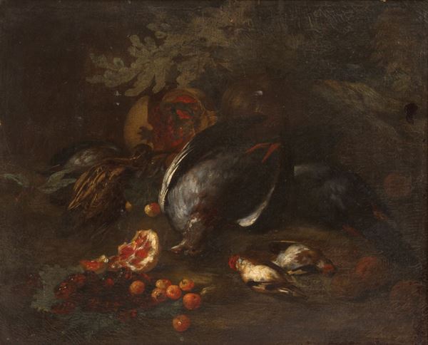 Oil painting on canvas depicting ''STILL LIFE WITH FRUIT AND VENISON''. 17th century. Framed. Defects and restorations. Already relined.