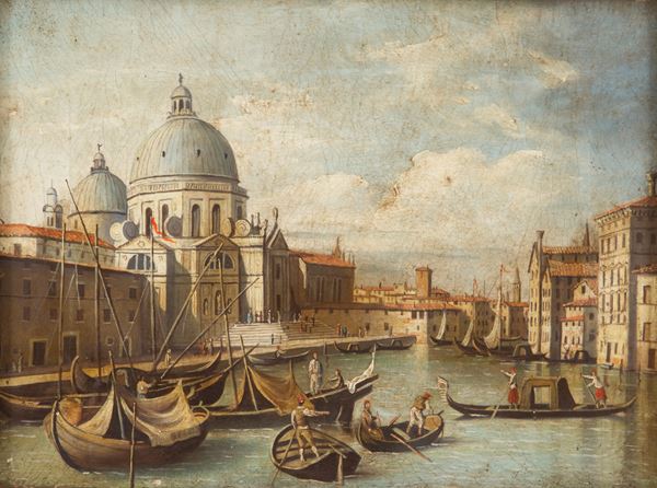 Oil painting on canvas depicting "VIEW OF THE CHURCH OF SANTA MARIA DELLA SALUTE IN VENICE". Late 19th-early 20th century. In a carved and gilded frame.
