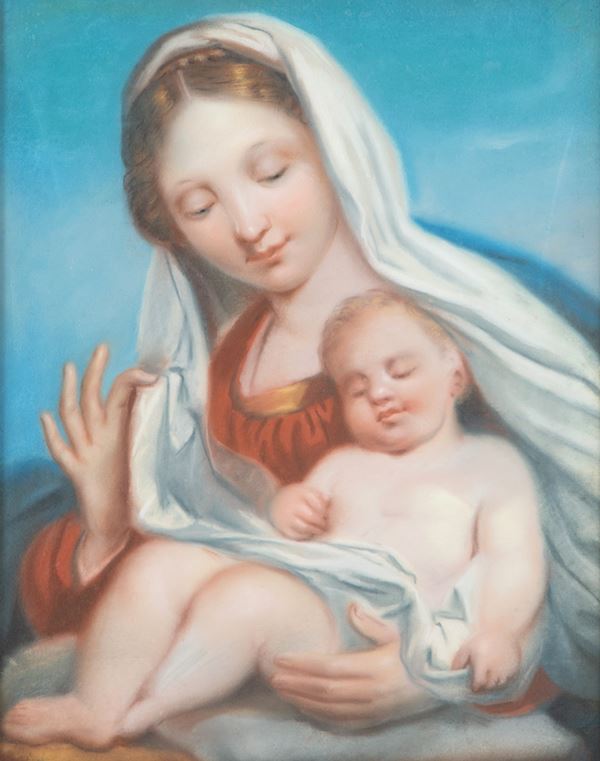 Pastel on cardboard depicting "MADONNA WITH CHILD". Late 19th century. Framed.