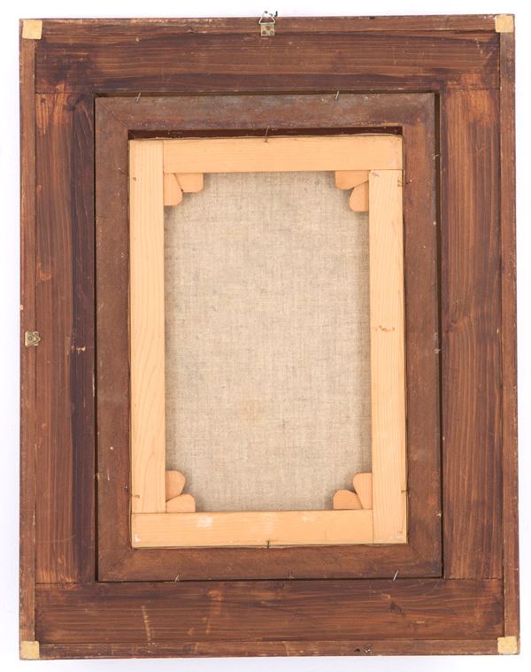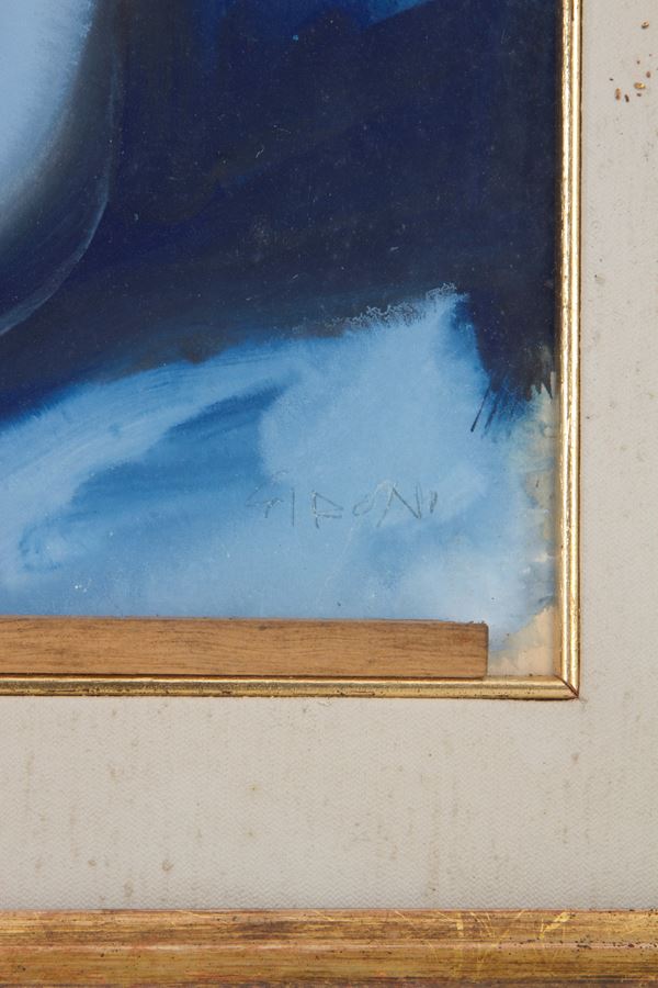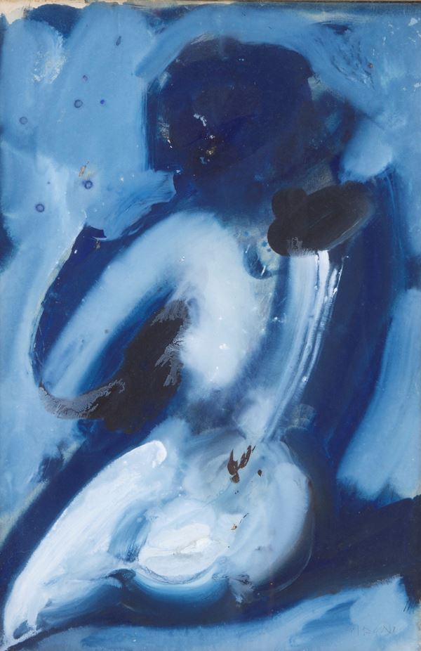 Mixed media, tempera and ink, on canvas paper depicting "NUDO DI BACK". Signed lower right. 1950s. Framed. With authentication by Francesco Meloni on photograph.