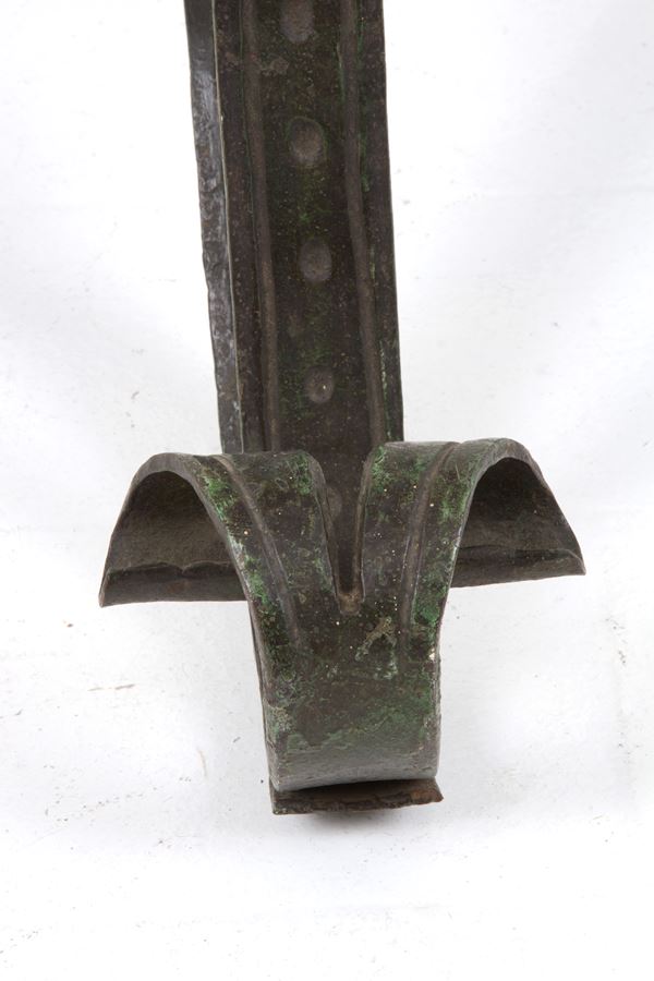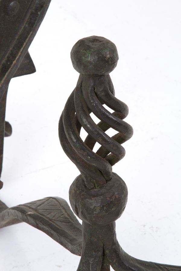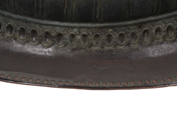Large patinated copper basin on wrought iron tripod stand. Early 18th century. Non-contemporary stand. Minor defects.
