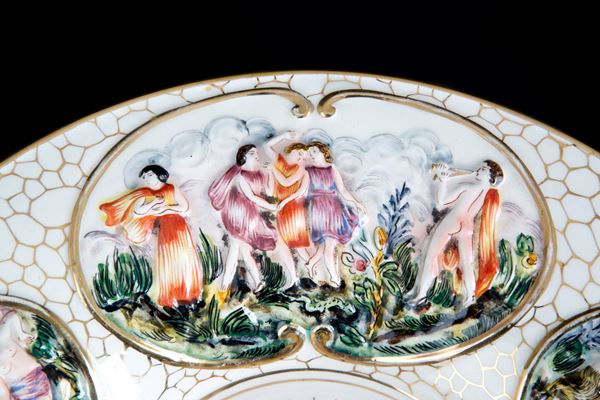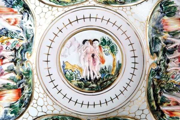 Ceramic plate depicting "MYTHOLOGICAL SCENES". Marked CAPODIMONTE on the bottom. 20th century.