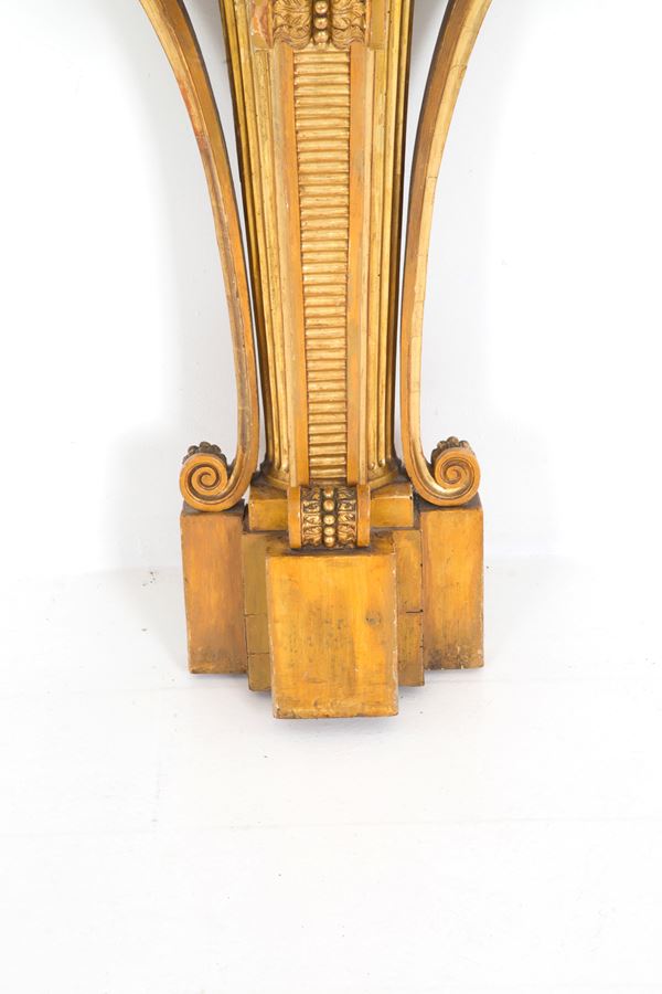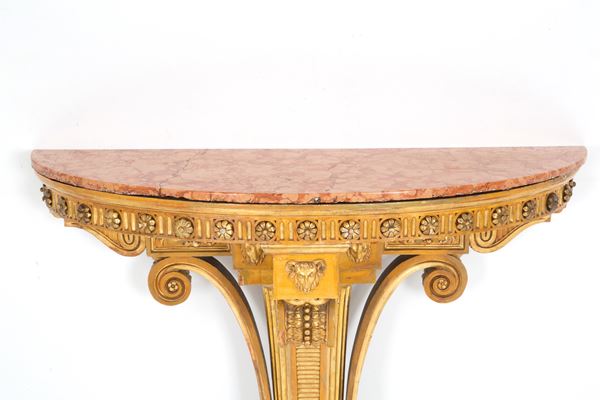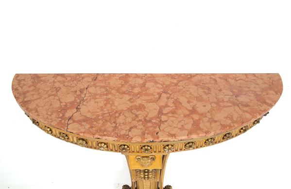 Finely carved and gilded wooden half-moon console with red marble top. 19th century. Minor defects.
