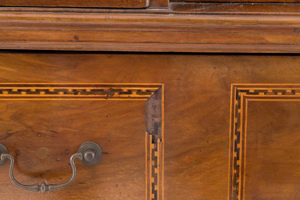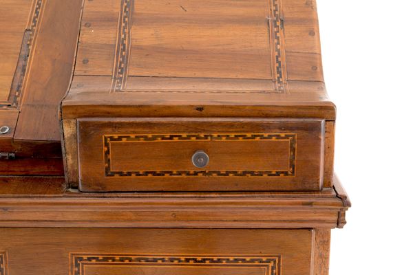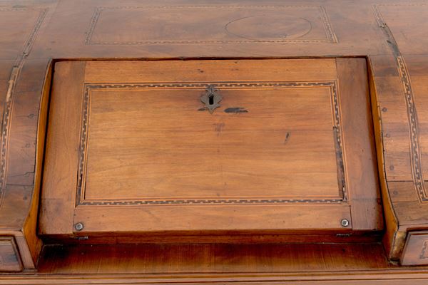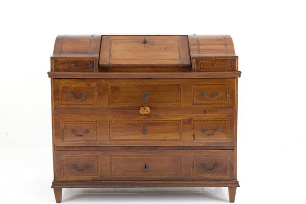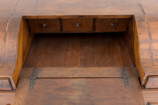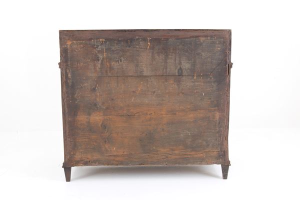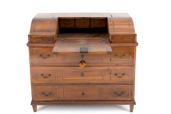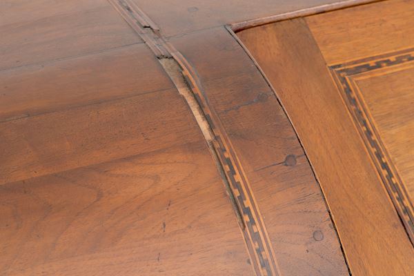Trentino walnut drop-leaf chest of drawers with various wooden threads and bronze fittings. Early 19th century. Defects and missing parts.