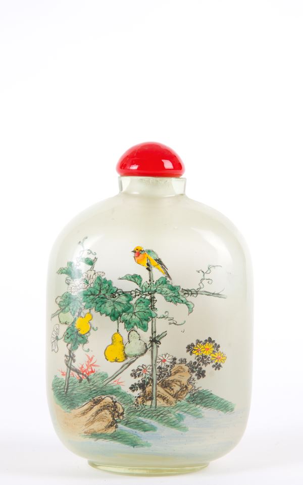 Snuff bottle in glass back painted with oriental landscape and red glass stopper. China.