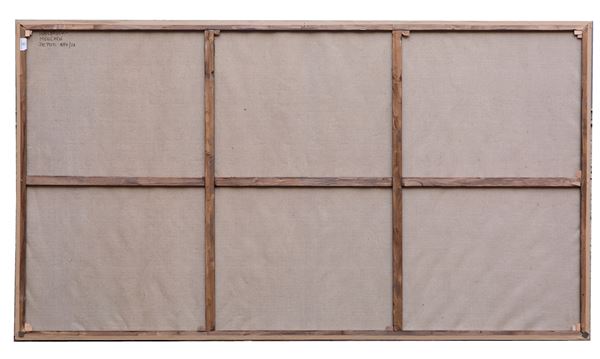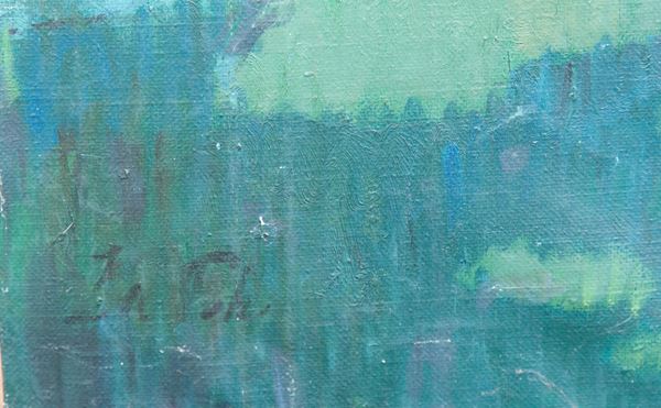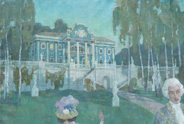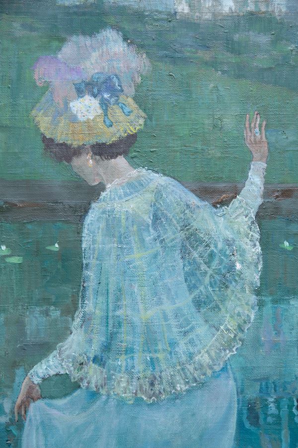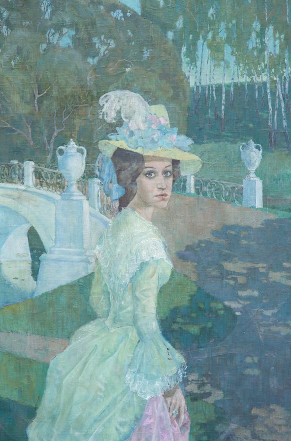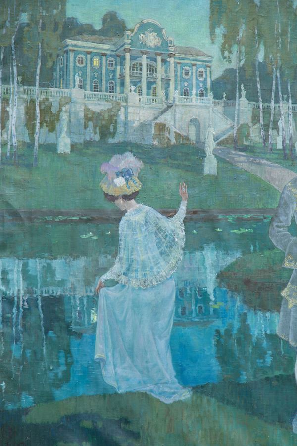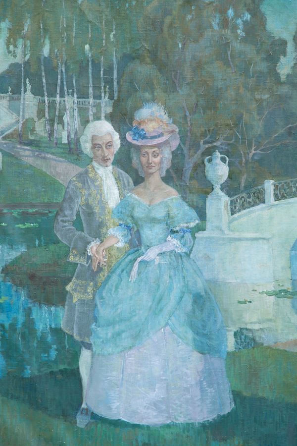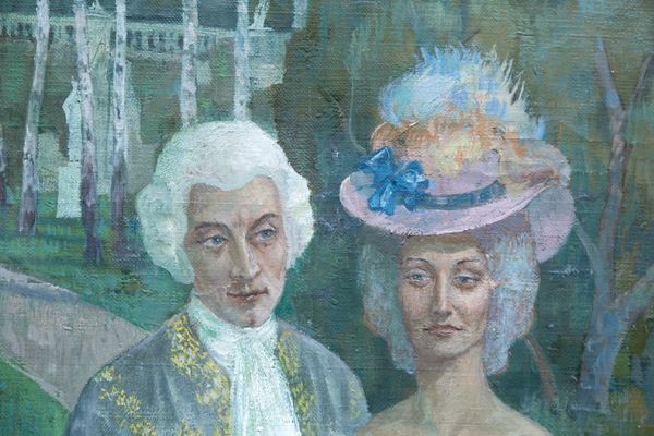 Large oil painting on canvas depicting "CHARACTERS IN THE GARDEN". Unidentified signature lower left. 20th century.
