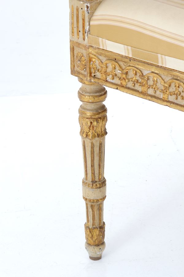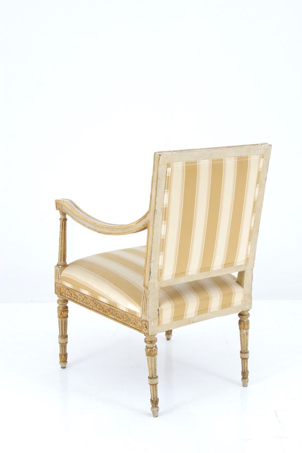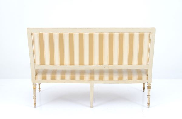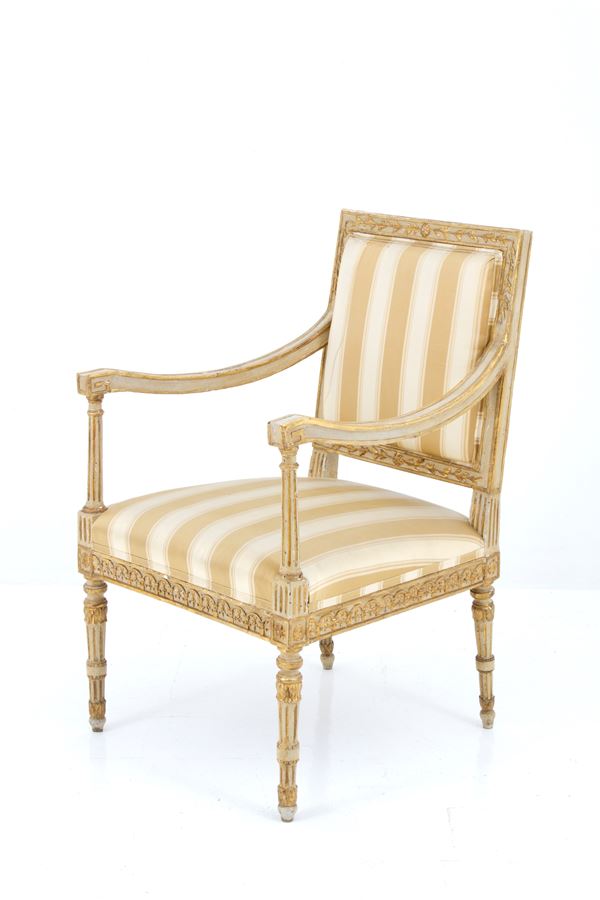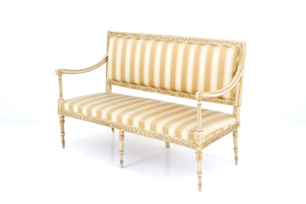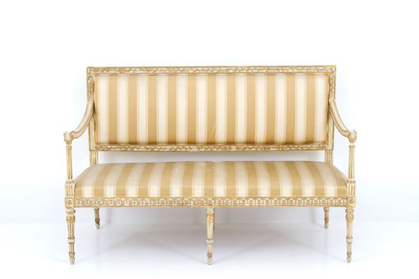 Lacquered and gilded wooden living room set consisting of three armchairs and a sofa with seats and backs upholstered in satin. Louis XVI period. Minor defects and missing parts.