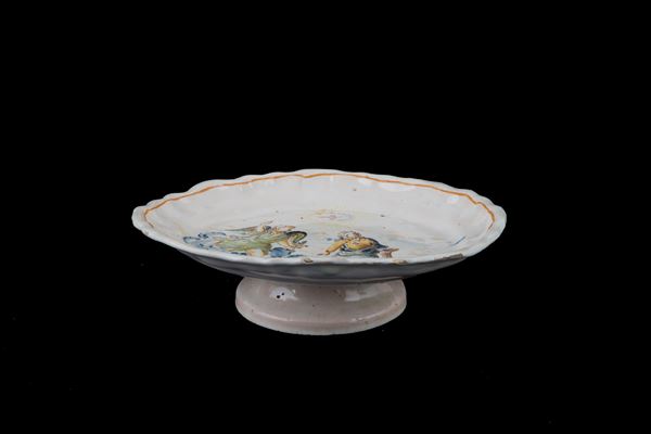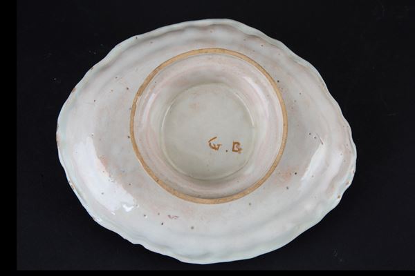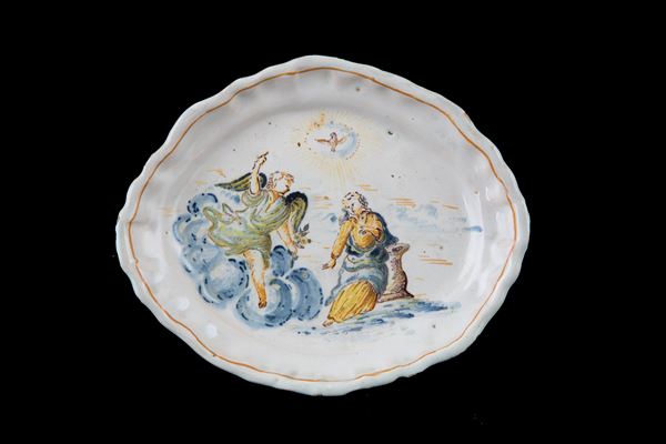 Painted majolica backsplash depicting "ANNUNCIATION". Initialed on the bottom. Savona manufacture. 17th century.