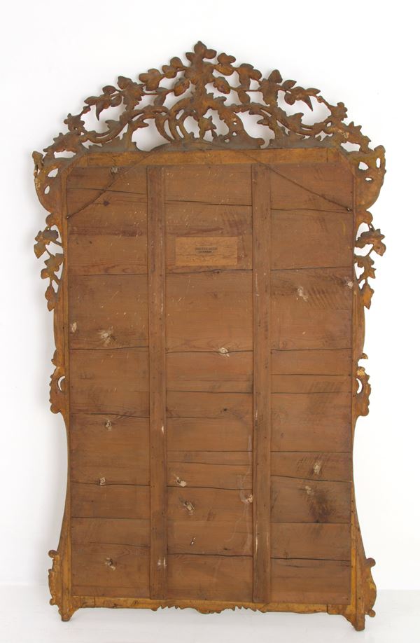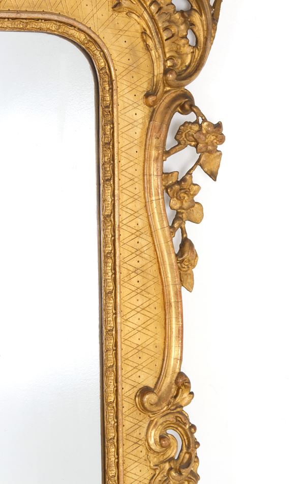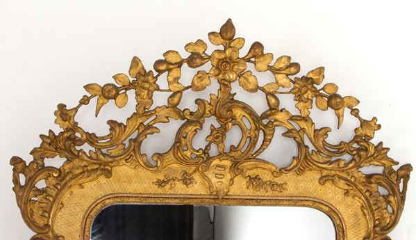 Carved and gilded wooden mirror with floral motifs. 19th century. Minor defects.