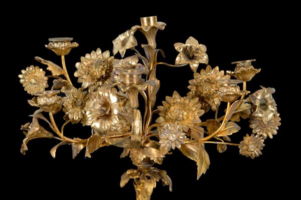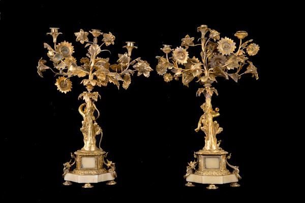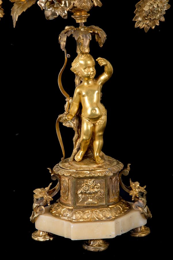 Pair of six-light candelabra in gilded bronze and onyx with cherubs and flowers. Late 19th century. Defects, breaks and missing parts.