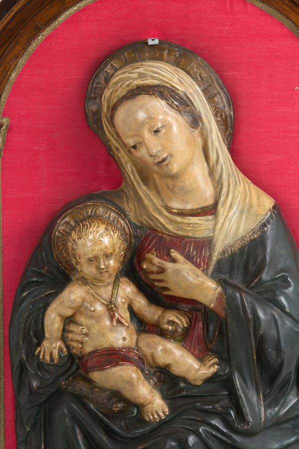 Polychrome papier-mâché sculpture depicting "MADONNA OF THE MILK". 18th century. In a non-contemporary aedicule. Minor defects.