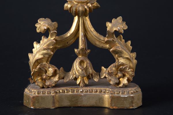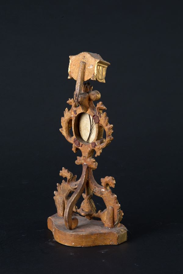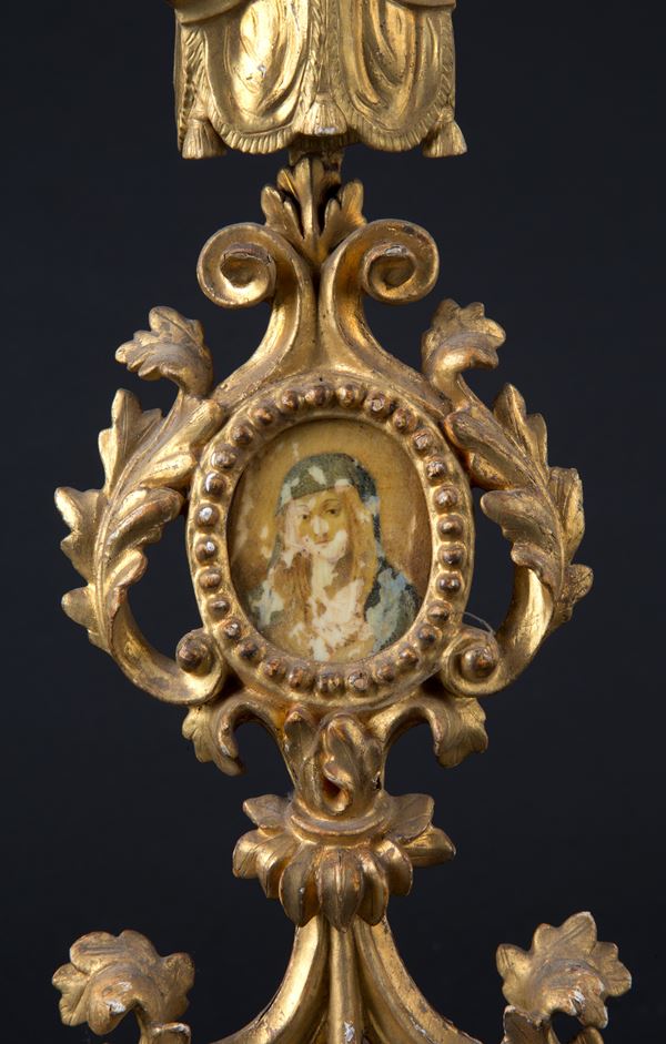 Carved and gilded wooden relic holder with miniature depicting the Virgin Mary. 18th century. Defects.