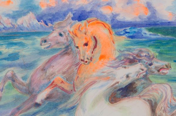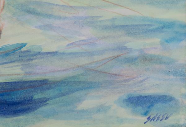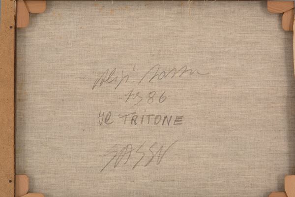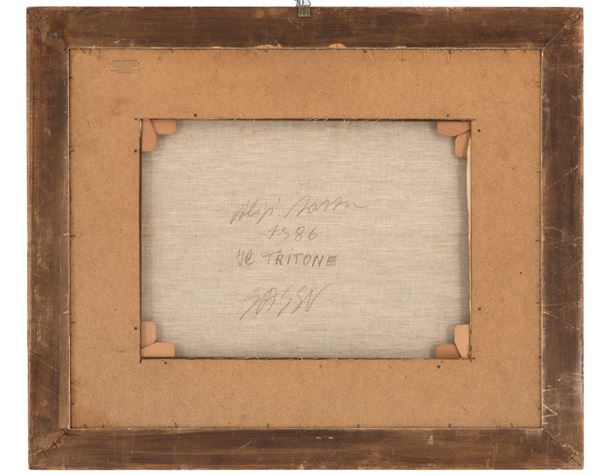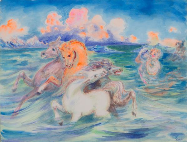 Watercolor on canvas titled "I TRITONI". Signed lower right. Countersigned, titled and dated 1986 on the back. Framed.
