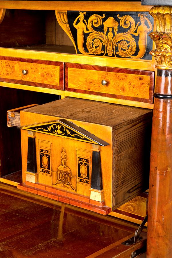 Secretaire inlaid in various woods with columns. Biedermeier period. Minor defects.