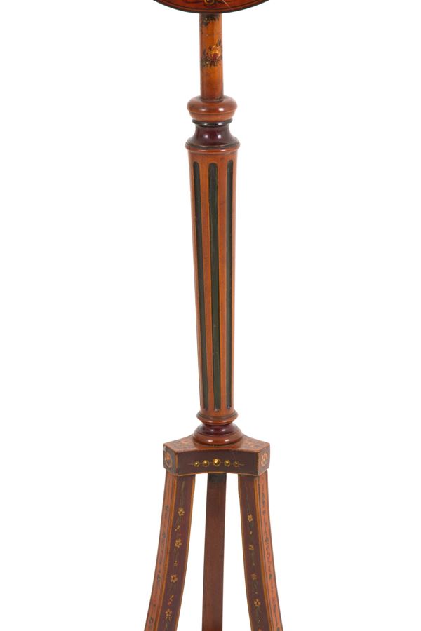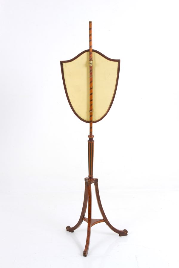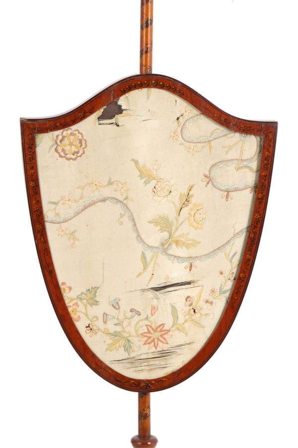 Shield-shaped spark arrester in finely painted wood with tripod leg and embroidered fabric with floral motifs. Height-adjustable shield. Charles X period. Defects.