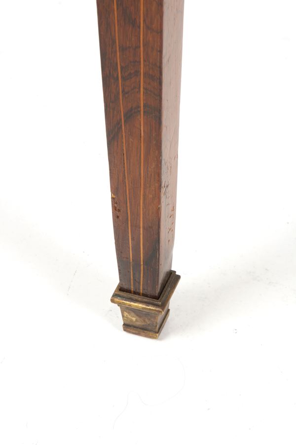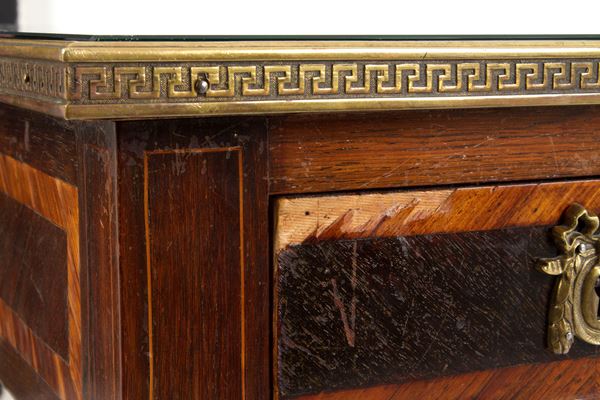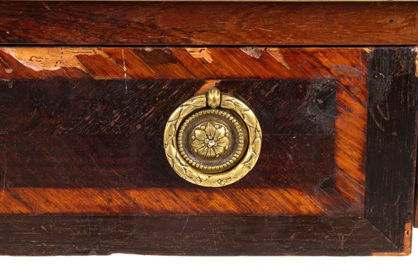 Veneered wooden desk with gilded bronze fittings, three drawers on the band, pyramidal legs and leather top. France. 19th century. Defects and minor losses.
