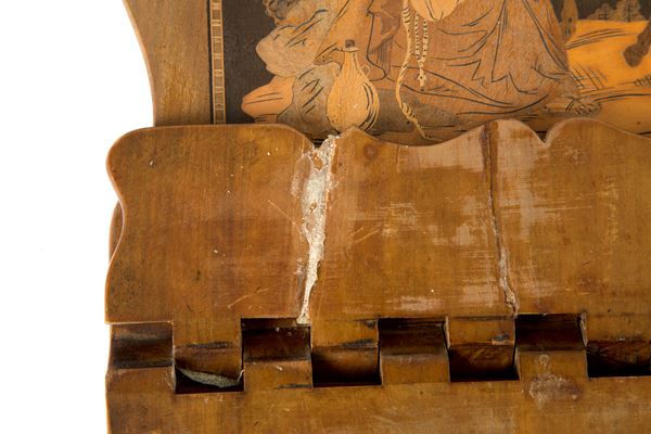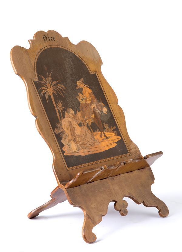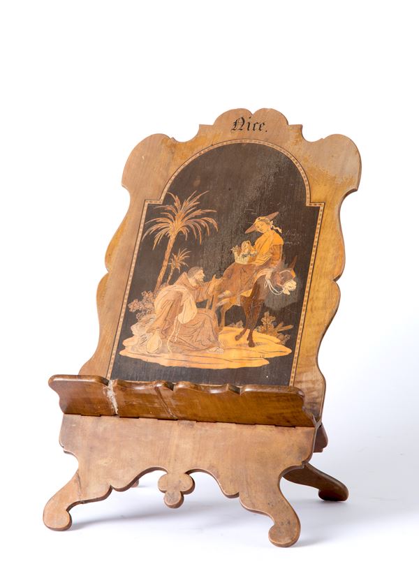 Inlaid wooden lectern depicting "THE FLIGHT INTO EGYPT". Sorrento's manufacture. 19th century. Minor defects.
