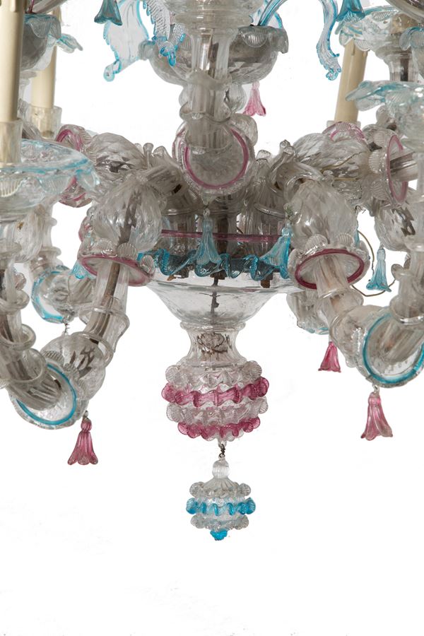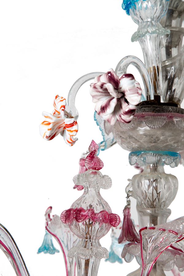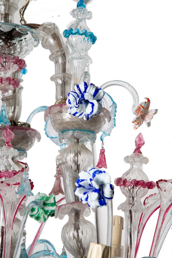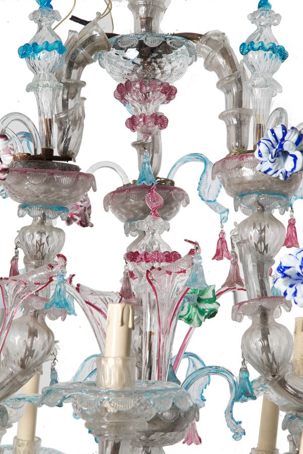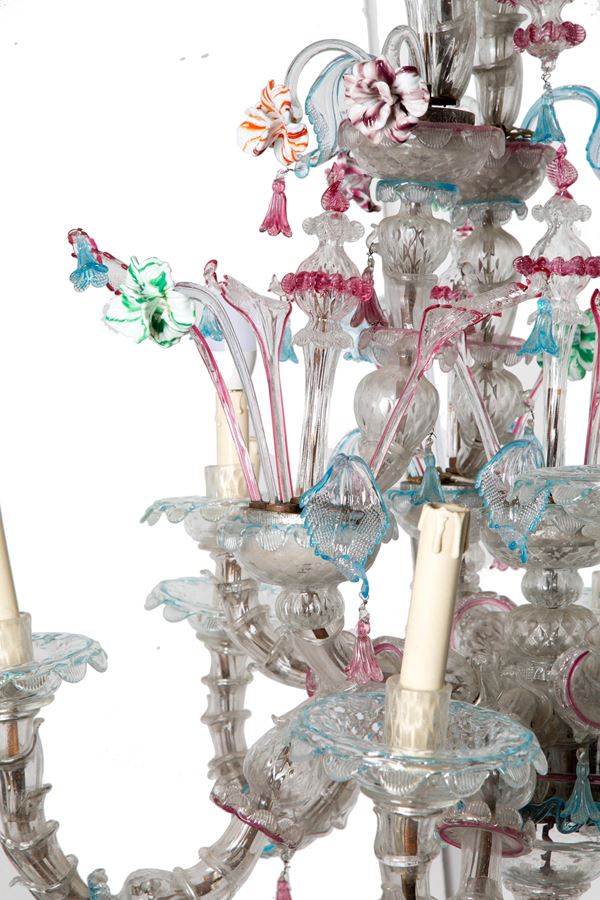 Ca' Rezzonico nine-light chandelier in polychrome Murano glass. Late 18th century. Defects, missing parts and slight breakages.