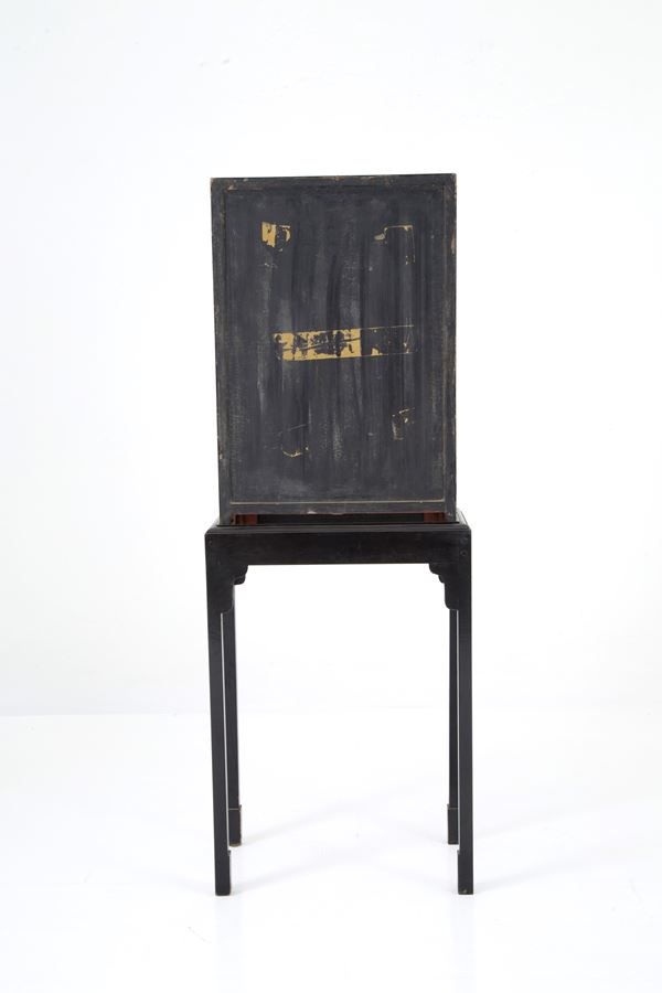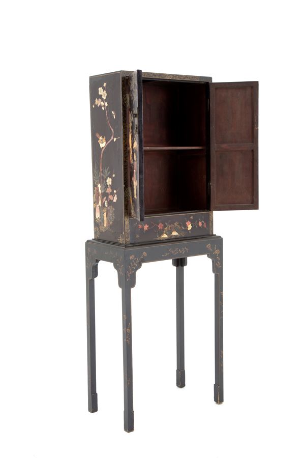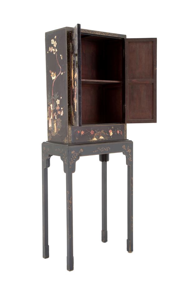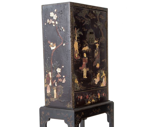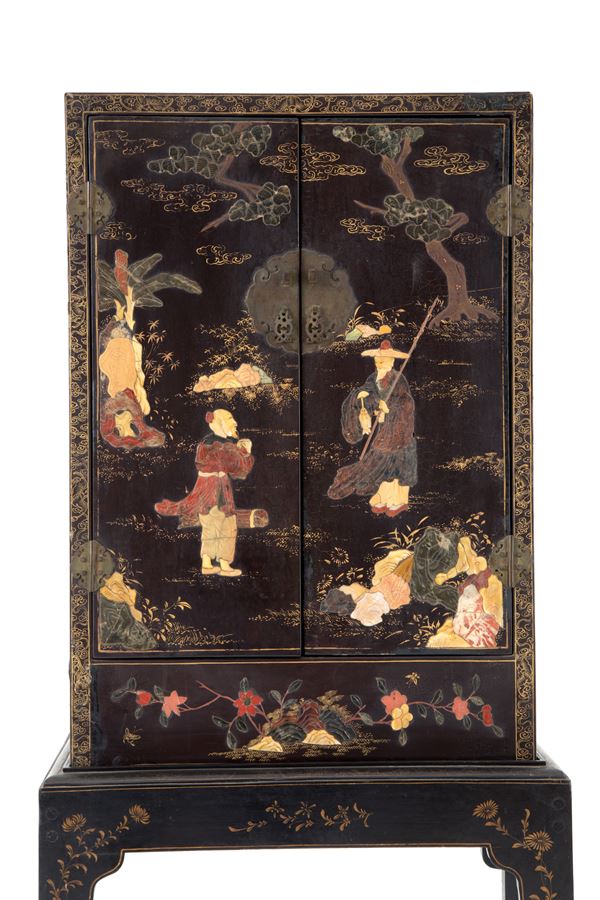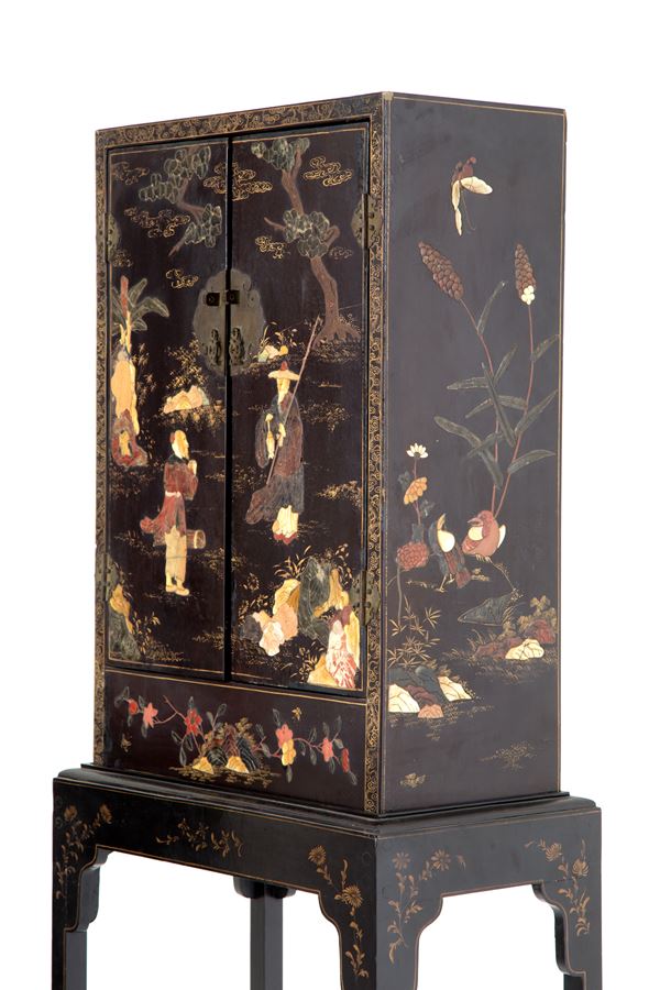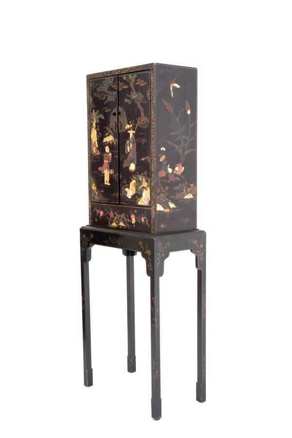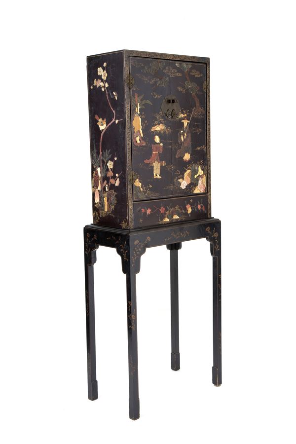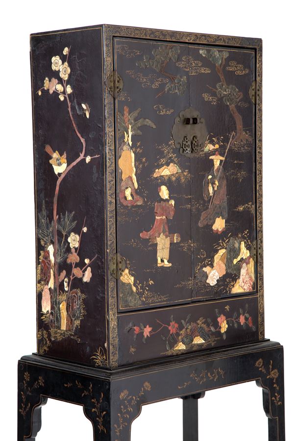 Cabinet with lacquered wooden base with mother-of-pearl and semiprecious stone inserts. China. 19th century. Minor defects and missing parts.