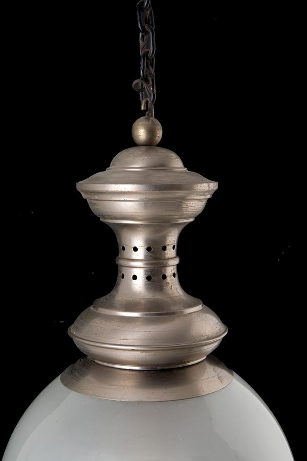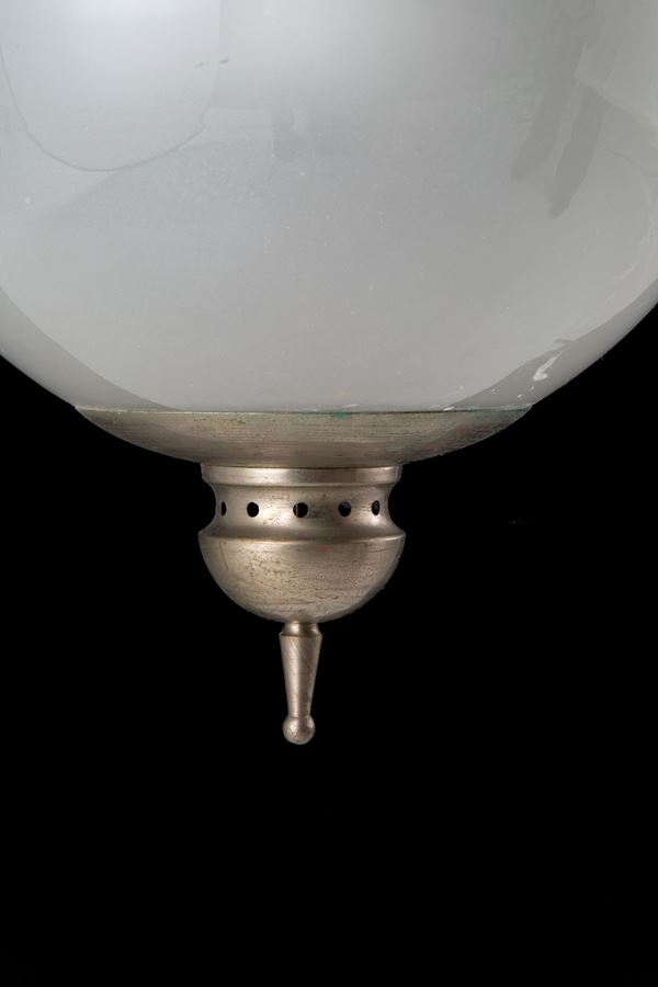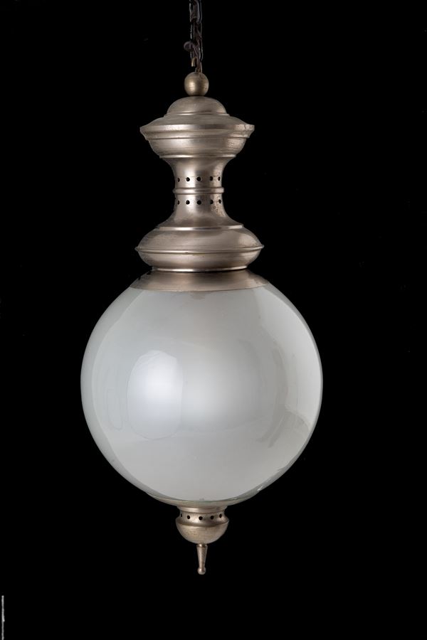 Chandelier model LS1 GC in satin brass and opaque glass. AZUCENA production . 1960s-1970s. Signs of wear and tear.