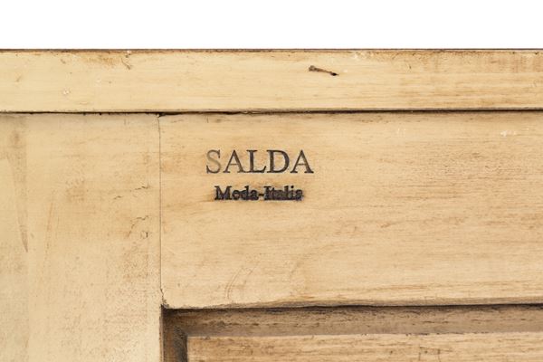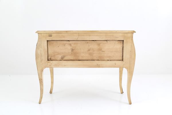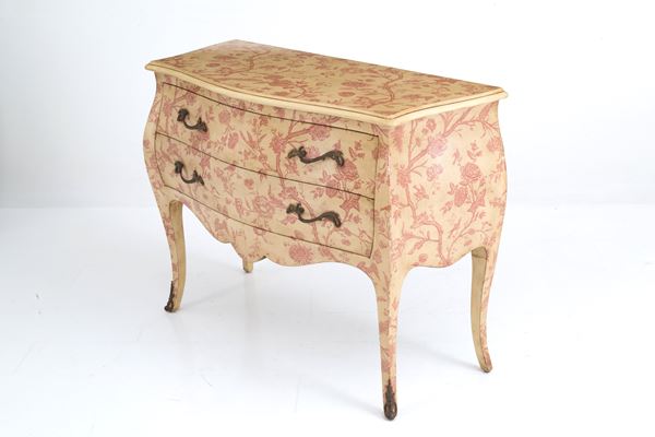 Curved chest of drawers with two drawers decorated with floral and bird motifs with bronze fittings. Marked SALDA on the back. Minor defects.