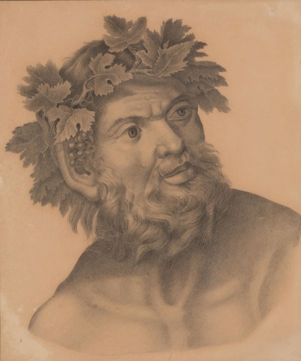 Pencil drawing on paper depicting "BACCHUS". 19th century. In carved and gilded frame.